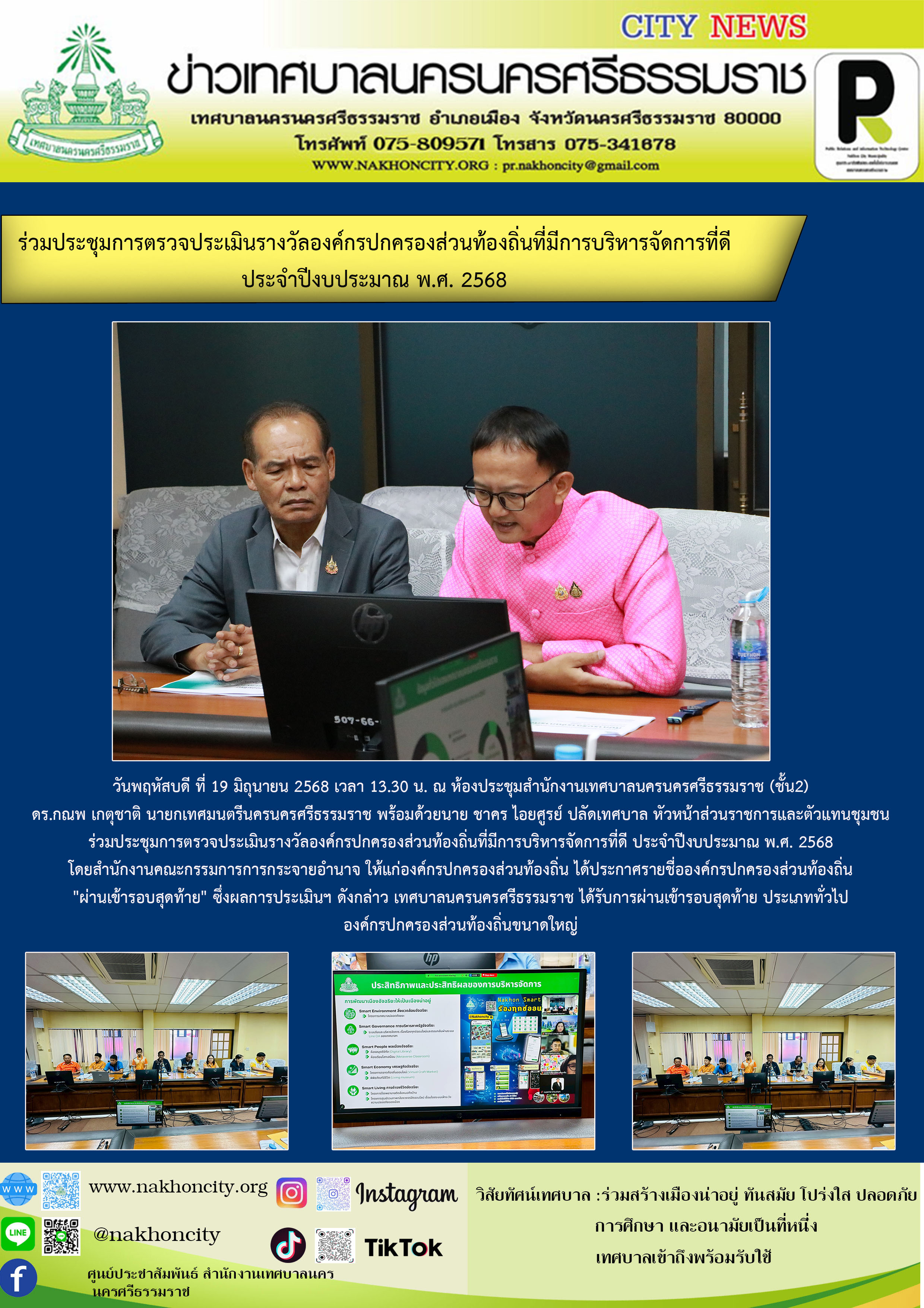วันพฤหัสบดี ที่ 19 มิถุนายน 2568 เวลา 13.30 น. ณ ห้องประชุมสำนักงานเทศบาลนครนครศรีธรรมราช (ชั้น2) ดร.กณพ เกตุชาติ นายกเทศมนตรีนครนครศรีธรรมราช พร้อมด้วยนาย ชาคร ไอยศูรย์ ปลัดเทศบาล หัวหน้าส่วนราชการและตัวแทนชุมชน ร่วมประชุมการตรวจประเมินรางวัลองค์กรปกครองส่วนท้องถิ่นที่มีการบริหารจัดการที่ดี ประจำปีงบประมาณ พ.ศ. 2568 โดยสำนักงานคณะกรรมการการกระจายอำนาจ ให้แก่องค์กรปกครองส่วนท้องถิ่น ได้ประกาศรายชื่อองค์กรปกครองส่วนท้องถิ่น "ผ่านเข้ารอบสุดท้าย" ซึ่งผลการประเมินฯ ดังกล่าว เทศบาลนครนครศรีธรรมราช ได้รับการผ่านเข้ารอบสุดท้าย ประเภททั่วไป องค์กรปกครองส่วนท้องถิ่นขนาดใหญ่ ภาพ//ข่าว//ไกรสิทธิ |