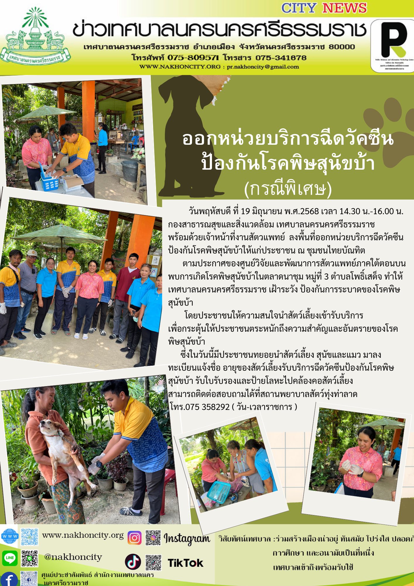 วันพฤหัสบดี ที่ 19 มิถุนายน พ.ศ.2568 เวลา 14.30 น.-16.00 น. กองสาธารณสุขและสิ่งแวดล้อม เทศบาลนครนครศรีธรรมราช พร้อมด้วยเจ้าหน้าที่งานสัตวแพทย์ ลงพื้นที่ออกหน่วยบริการฉีดวัคซีนป้องกันโรคพิษสุนัขบ้าให้แก่ประชาชน ณ ชุมชนไทยบัณทิต ตามประกาศของศูนย์วิจัยและพัฒนาการสัตวแพทย์ภาคใต้ตอนบน พบการเกิดโรคพิษสุนัขบ้าในตลาดนาชุม หมู่ที่ 3 ตำบลโพธิ์เสด็จ ทำให้เทศบาลนครนครศรีธรรมราช เฝ้าระวัง ป้องกันการระบาดของโรคพิษสุนัขบ้าในพื้นที่ดังกล่าว ซึ่งในวันนี้มีประชาชนทยอยนำสัตว์เลี้ยง สุนัขและแมว มาลงทะเบียนแจ้งชื่อ อายุของสัตว์เลี้ยงรับบริการฉีดวัคซีนป้องกันโรคพิษสุนัขบ้า รับใบรับรองและป้ายโลหะไปคล้องคอสัตว์เลี้ยง สามารถติดต่อสอบถามได้ที่สถานพยาบาลสัตว์ทุ่งท่าลาด โทร.075 358292 ( วัน-เวลาราชการ ) |