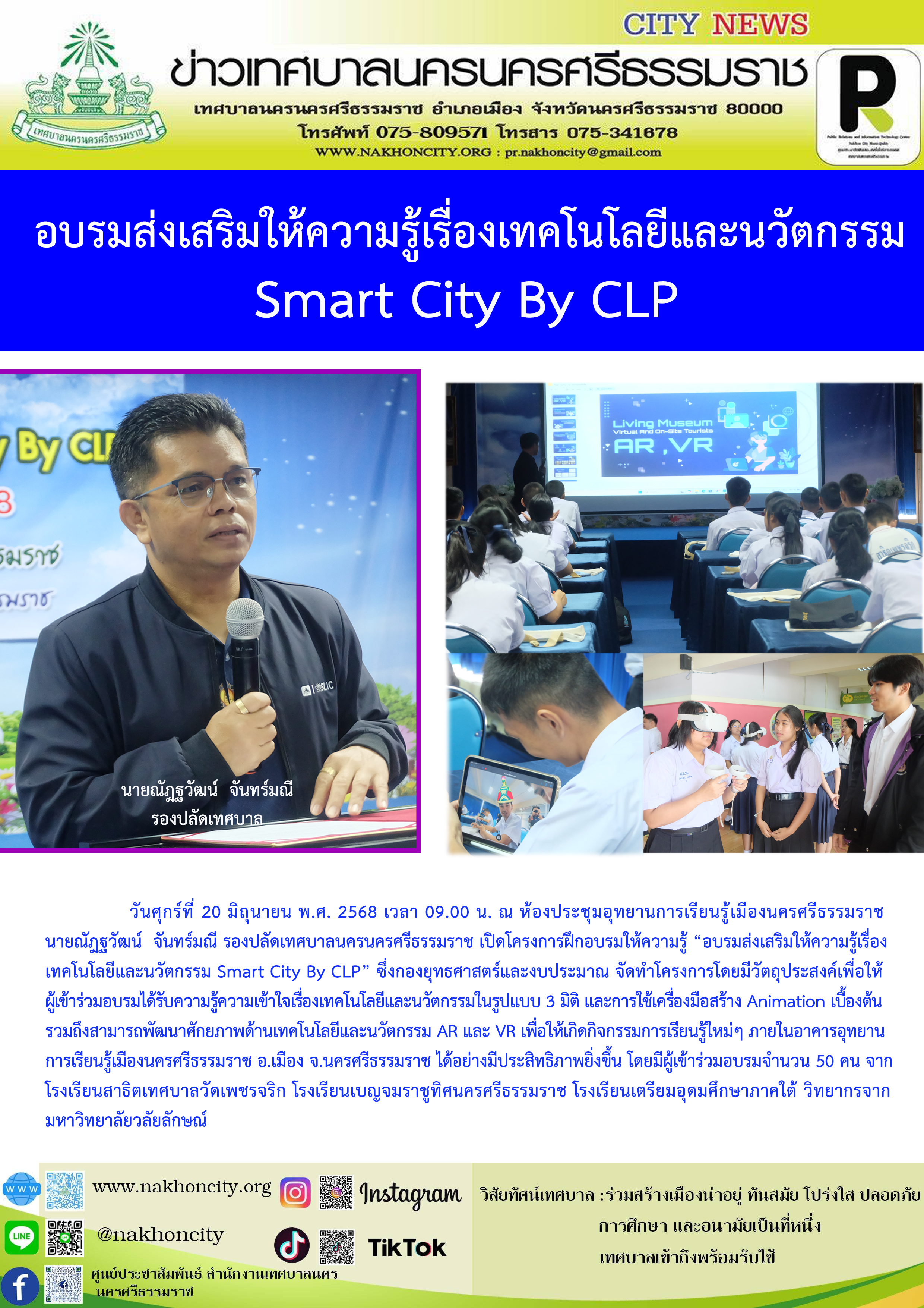 เทศบาลนครนครศรีธรรมราช ฝึกอบรมให้ความรู้ “อบรมส่งเสริมให้ความรู้เรื่องเทคโนโลยีและนวัตกรรม Smart City By CLP” |