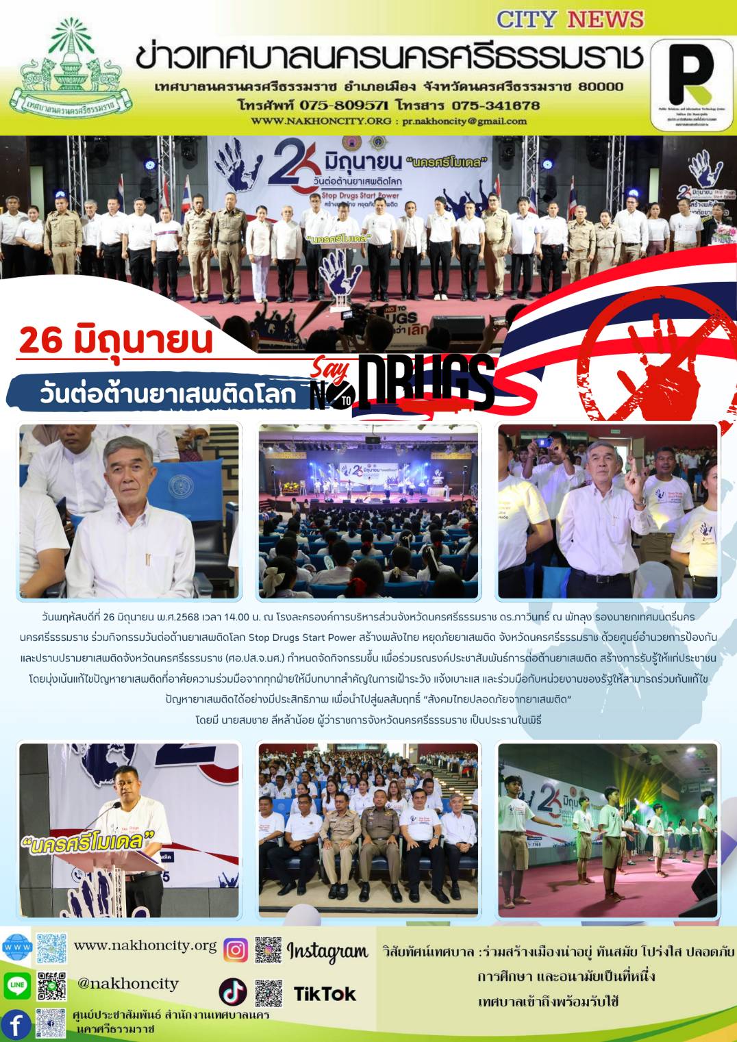 วันพฤหัสบดีที่ 26 มิถุนายน พ.ศ.2568 เวลา 14.00 น. ณ โรงละครองค์การบริหารส่วนจังหวัดนครศรีธรรมราช ดร.ภาวินทร์ ณ พัทลุง รองนายกเทศมนตรีนครนครศรีธรรมราช ร่วมกิจกรรมวันต่อต้านยาเสพติดโลก Stop Drugs Start Power สร้างพลังไทย หยุดภัยยาเสพติด จังหวัดนครศรีธรรมราช ด้วยศูนย์อำนวยการป้องกันและปราบปรามยาเสพติดจังหวัดนครศรีธรรมราช (ศอ.ปส.จ.นศ.) กำหนดจัดกิจกรรมขึ้น เพื่อร่วมรณรงค์ประชาสัมพันธ์การต่อต้านยาเสพติด สร้างการรับรู้ให้แก่ประชาชน โดยมุ่งเน้นแก้ไขปัญหายาเสพติดที่อาศัยความร่วมมือจากทุกฝ่ายให้มีบทบาทสำคัญในการเฝ้าระวัง แจ้งเบาะแส และร่วมมือกับหน่วยงานของรัฐให้สามารถร่วมกันแก้ไขปัญหายาเสพติดได้อย่างมีประสิทธิภาพ เพื่อนำไปสู่ผลสัมฤทธิ์ “สังคมไทยปลอดภัยจากยาเสพติด” โดยมี นายสมชาย ลีหล้าน้อย ผู้ว่าราชการจังหวัดนครศรีธรรมราช เป็นประธานในพิธี ..................... ภาพ//ข่าว//จันทร์จิรา ตรวจทาน//ฐิตินันท์ |