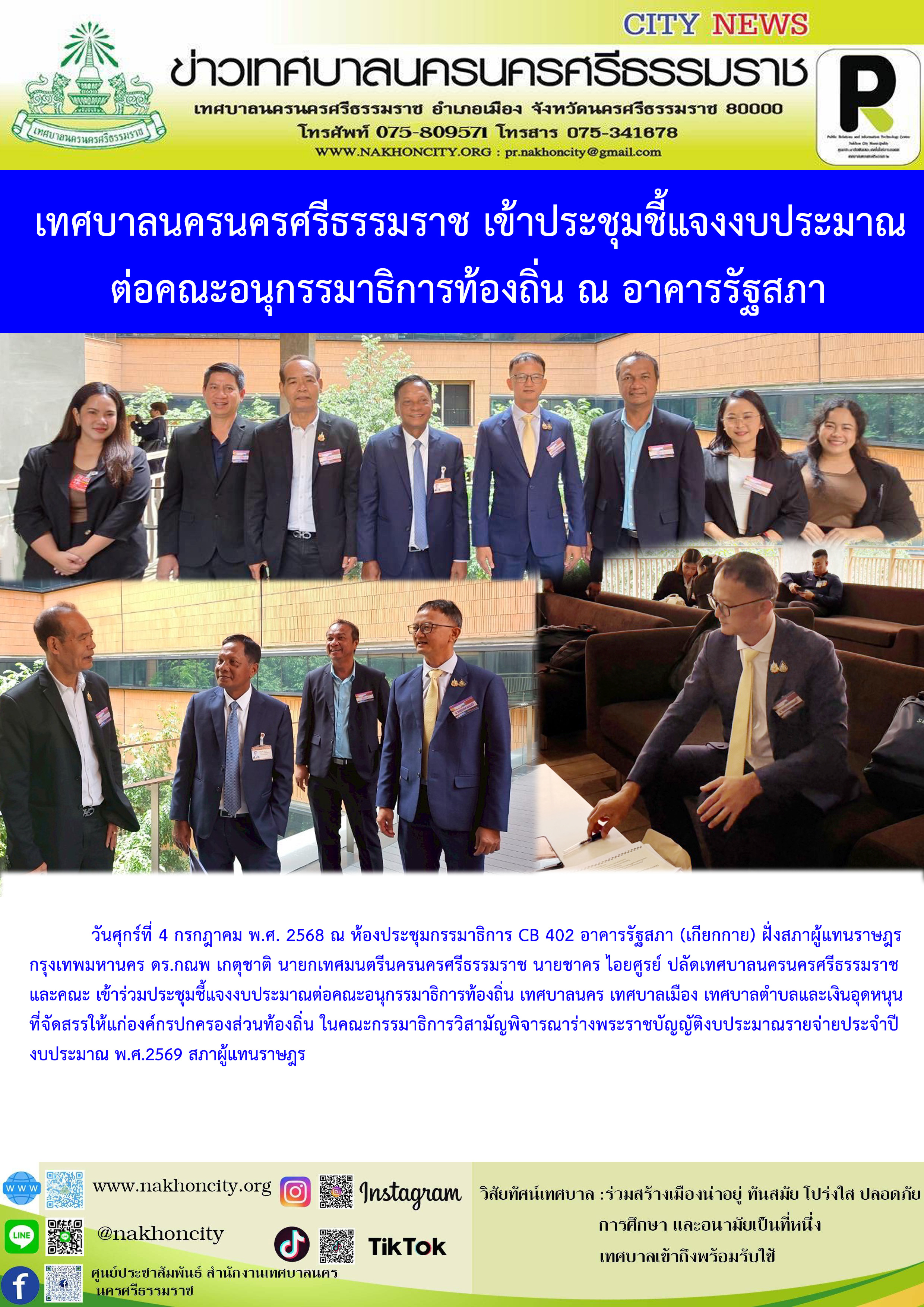 วันศุกร์ที่ 4 กรกฎาคม พ.ศ. 2568 ณ ห้องประชุมกรรมาธิการ CB 402 อาคารรัฐสภา (เกียกกาย) ฝั่งสภาผู้แทนราษฎร กรุงเทพมหานคร ดร.กณพ เกตุชาติ นายกเทศมนตรีนครนครศรีธรรมราช นายชาคร ไอยศูรย์ ปลัดเทศบาลนครนครศรีธรรมราช และคณะ เข้าร่วมประชุมชี้แจงงบประมาณ ต่อคณะอนุกรรมาธิการท้องถิ่น เทศบาลนคร เทศบาลเมือง เทศบาลตำบล และเงินอุดหนุนที่จัดสรรให้แก่องค์กรปกครองส่วนท้องถิ่น ในคณะกรรมาธิการวิสามัญพิจารณาร่างพระราชบัญญัติงบประมาณรายจ่ายประจำปีงบประมาณ พ.ศ.2569 สภาผู้แทนราษฎร |