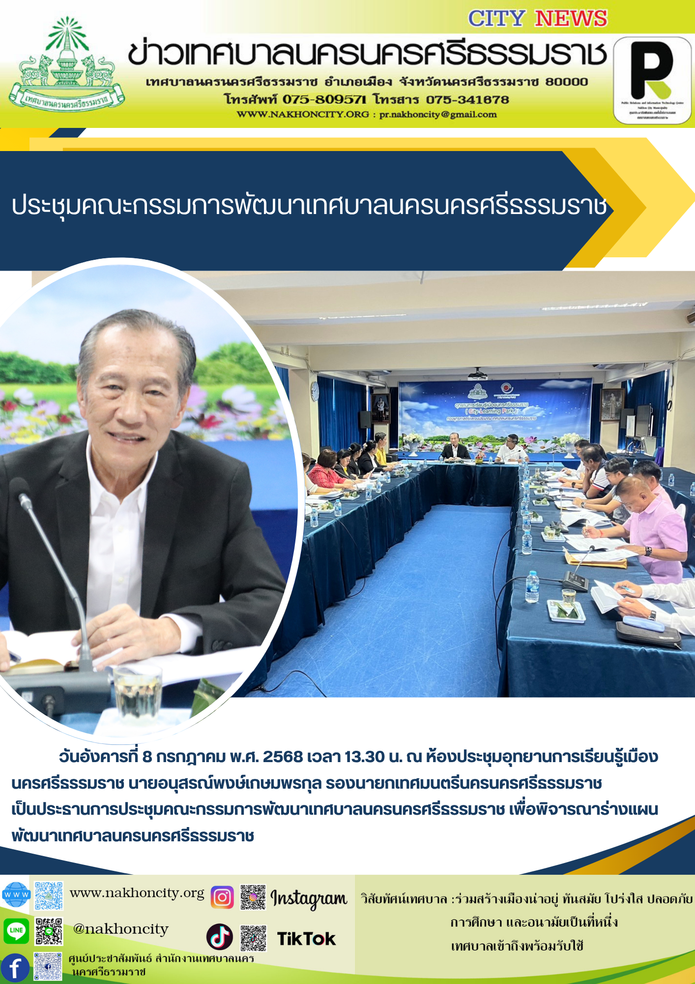 วันอังคารที่ 8 กรกฎาคม พ.ศ. 2568 เวลา 13.30 น. ณ ห้องประชุมอุทยานการเรียนรู้เมืองนครศรีธรรมราช นายอนุสรณ์ พงษ์เกษมพรกุล รองนายกเทศมนตรีนครนครศรีธรรมราช เป็นประธานการประชุมคณะกรรมการพัฒนาเทศบาลนครนครศรีธรรมราช เพื่อพิจารณาร่างแผนพัฒนาเทศบาลนครนครศรีธรรมราช