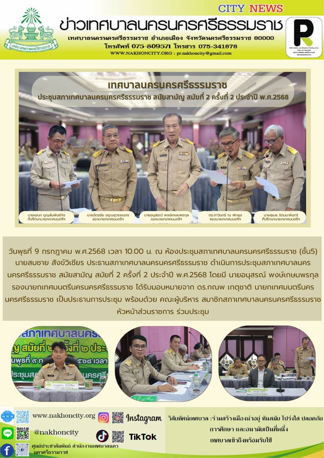 วันพุธที่ 9 กรกฎาคม พ.ศ.2568 เวลา 10.00 น. ณ ห้องประชุมสภาเทศบาลนครนครศรีธรรมราช (ชั้น5) นายสมชาย สังข์วิเชียร ประธานสภาเทศบาลนครนครศรีธรรมราช ดำเนินการประชุมสภาเทศบาลนครนครศรีธรรมราช สมัยสามัญ สมัยที่ 2 ครั้งที่ 2 ประจำปี พ.ศ.2568 โดยมี นายอนุสรณ์ พงษ์เกษมพรกุล รองนายกเทศมนตรีนครนครศรีธรรมราช ได้รับมอบหมายจาก ดร.กณพ เกตุชาติ นายกเทศมนตรีนครนครศรีธรรมราช เป็นประธานการประชุม พร้อมด้วย คณะผู้บริหาร สมาชิกสภาเทศบาลนครนครศรีธรรมราช หัวหน้าส่วนราชการ ร่วมประชุม โดยมีระเบียบวาระการประชุมดังนี้ ระเบียบวาระที่ 1 เรื่องที่ปะธานสภาเทศบาลฯ จะแจ้งให้ที่ประชุมทราบ (ถ้ามี) ระเบียบวาระที่ 2 เรื่องรับรองรายงานการประชุม 2.1 รายงานการประชุมสภาเทศบาลนครนครศรีธรรมราช ครั้งแรก ประชุมเมื่อวันจันทร์ที่ 16 มิถุนายน พ.ศ.2568 เวลา 10.00 น. ณ ห้องประชุมสภาเทศบาลนครนครศรีธรรมราช (ชั้น5) 2.2 รายงานการประชุมสภาเทศบาลนครนครศรีธรรมราช สมัยสามัญ สมัยที่ 2 ประจำปี พ.ศ.2568 ประชุมเมื่อวันจันทร์ที่ 23 มิถุนายน พ.ศ.2568 เวลา 10.00 น. ณ ห้องประชุมสภาเทศบาลนครนครศรีธรรมราช (ชั้น 5) ระเบียบวาระที่ 3 เครื่องกระทู้ถาม 3.1 เรื่อง การเตรียมความพร้อมในเหตุอุทกภัย 3.2 เรื่อง จำนวนและชนิดของสัตว์ในสวนสัตว์ทุ่งท่าลาด ระเบียบวาระที่ 4 เรื่องที่คณะกรรมการที่สภาท้องถิ่นตั้งขึ้นพิจารณาเสร็จแล้ว - ไม่มี ระเบียบวาระที่ 5 เรื่อง นายกเทศมนตรีฯ แจ้งต่อสภาเทศบาลนครนครศรีธรรมราช 5.1 แจ้งการประกาศใช้แผนการดำเนินงาน ประจำปีงบประมาณ พ.ศ.2568 - แผนการดำเนินงาน ประจำปีงบประมาณ พ.ศ.2568 แก้ไข ครั้งที่ 1/2568 เทศบาลนครนครศรีธรรมราช ระเบียบวาระที่ 6 เรื่อง ญัตติที่เสนอใหม่ ญัตติที่ 6.1 ขอเสนอญัตติเรื่อง ให้สภาเทศบาลคัดเลือกสมาชิกสภาเทศบาลนครนครศรีธรรมราชเป็นคณะกรรมการประเมินผลการปฏิบัติตามหลักเกณฑ์และวิธีการบริหารกิจการบ้านเมืองที่ดีของเทศบาลนครนครศรีธรรมราช (จำนวน 2 ท่าน) กองยุทธศาสตร์และงบประมาณ ญัตติที่ 6.2 ขอเสนอญัตติเรื่อง ให้สภาเทศบาลคัดเลือกสมาชิกสภาเทศบาลนครนครศรีธรรมราชเป็นกรรมการพัฒนาเทศบาลนครนครศรีธรรมราช (จำนวน 3 ท่าน) กองยุทธศาสตร์และงบประมาณ ญัตติที่ 6.3 ขอเสนอญัตติเรื่อง ให้สภาเทศบาลคัดเลือกสมาชิกสภาเทศบาลนครนครศรีธรรมราชเป็นคณะกรรมการติดตามและประเมินผลแผนพัฒนาเทศบาลนครนครศรีธรรมราช (จำนวน 3 ท่าน) กองยุทธศาสตร์และงบประมาณ ญัตติที่ 6.4 ขอเสนอญัตติเรื่อง ให้สภาเทศบาลคัดเลือกสมาชิกสภาเทศบาลเป็นกรรมการกองทุนหลักประกันสุขภาพเทศบาลนครนครศรีธรรมราช (จำนวน 2 ท่าน) กองทุนหลักประกันสุขภาพฯ ญัตติที่ 6.5 ขอเสนอ