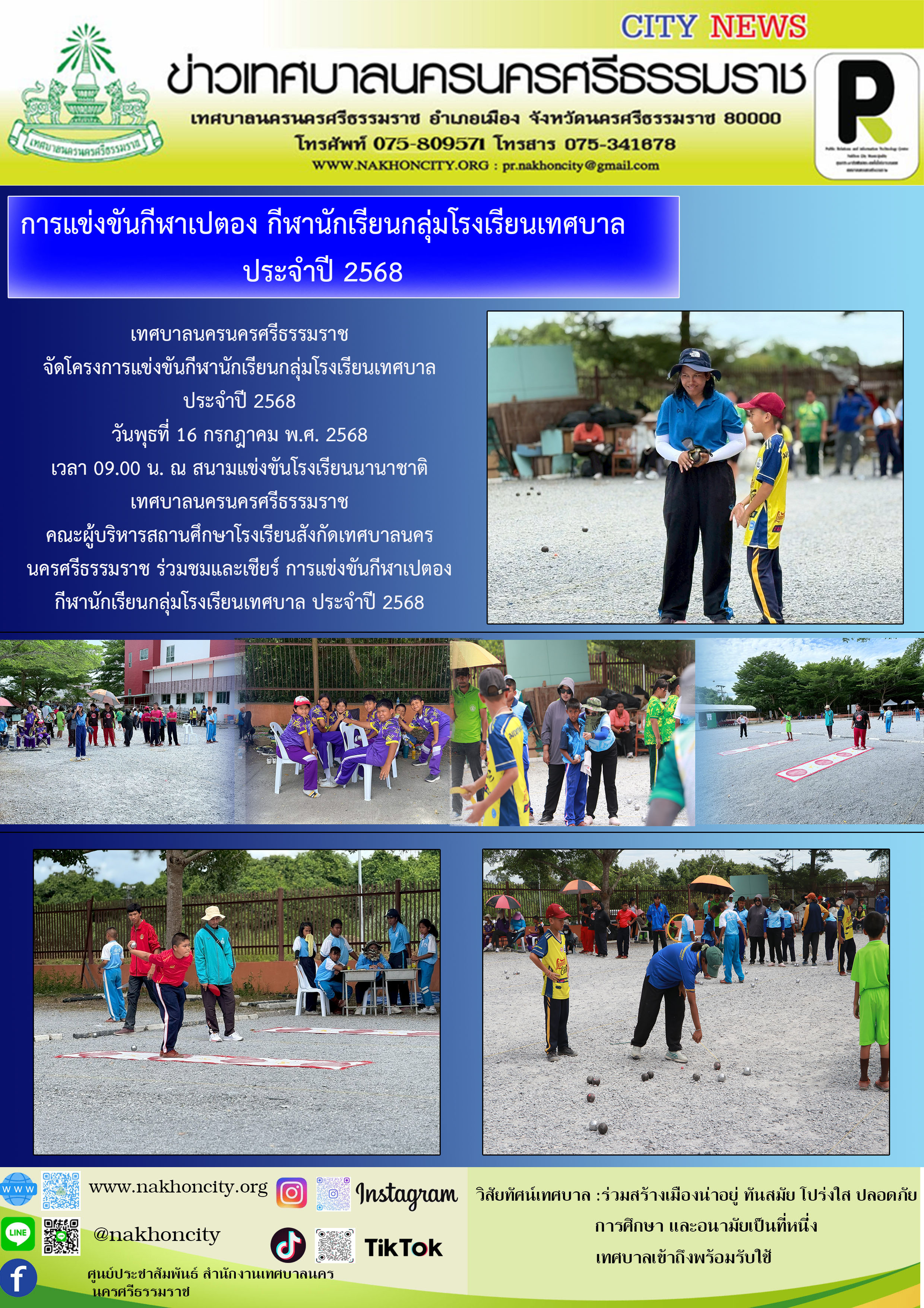 เทศบาลนครนครศรีธรรมราช จัดโครงการแข่งขันกีฬานักเรียนกลุ่มโรงเรียนเทศบาล ประจำปี 2568 วันพุธที่ 16 กรกฎาคม พ.ศ. 2568 เวลา 09.00 น. ณ สนามแข่งขันโรงเรียนนานาชาติ เทศบาลนครนครศรีธรรมราช คณะผู้บริหารสถานศึกษาโรงเรียนสังกัดเทศบาลนคร นครศรีธรรมราช ร่วมชมและเชียร์ การแข่งขันกีฬาเปตอง กีฬานักเรียนกลุ่มโรงเรียนเทศบาล ประจำปี 2568 |