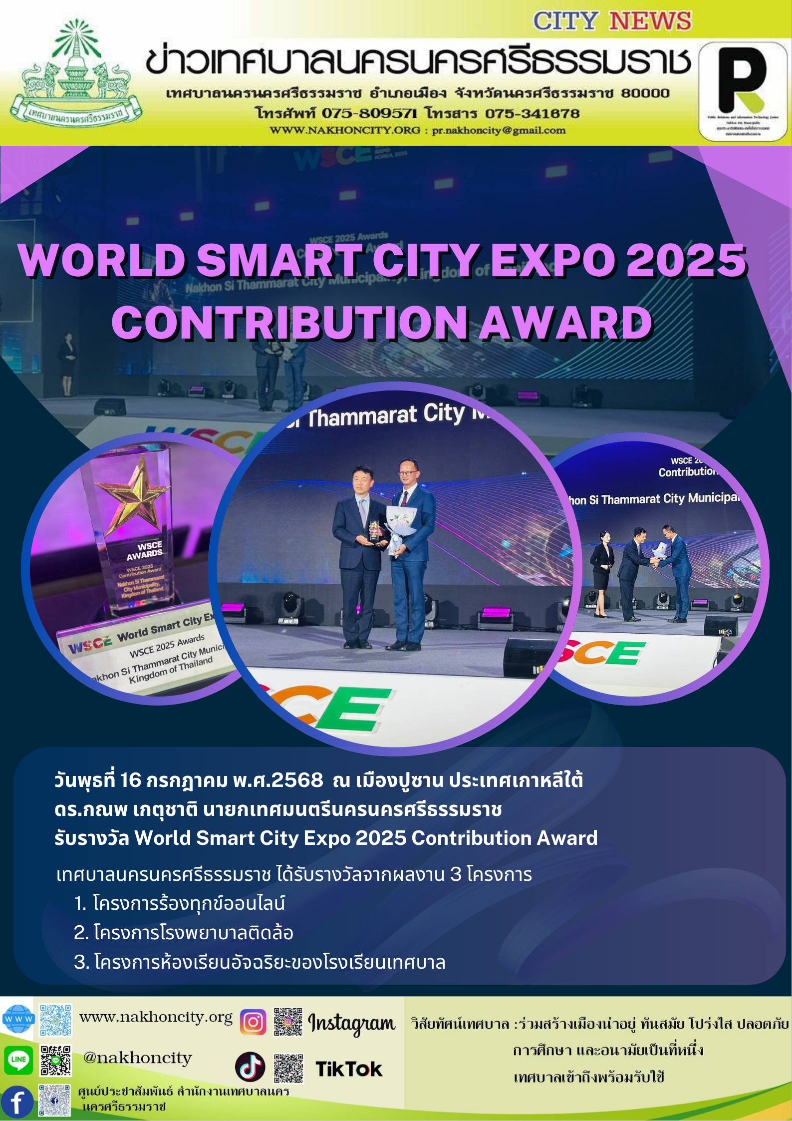 วันพุธที่ 16 กรกฎาคม พ.ศ.2568 ณ เมืองปูซาน ประเทศเกาหลีใต้ ดร.กณพ เกตุชาติ นายกเทศมนตรีนครนครศรีธรรมราช รับรางวัล World Smart City Expo 2025 Contribution Award เทศบาลนครนครศรีธรรมราช ได้รับรางวัลจากผลงาน 3 โครงการ 1. โครงการร้องทุกข์ออนไลน์ 2. โครงการโรงพยาบาลติดล้อ 3. โครงการห้องเรียนอัจฉริยะของโรงเรียนเทศบาล |