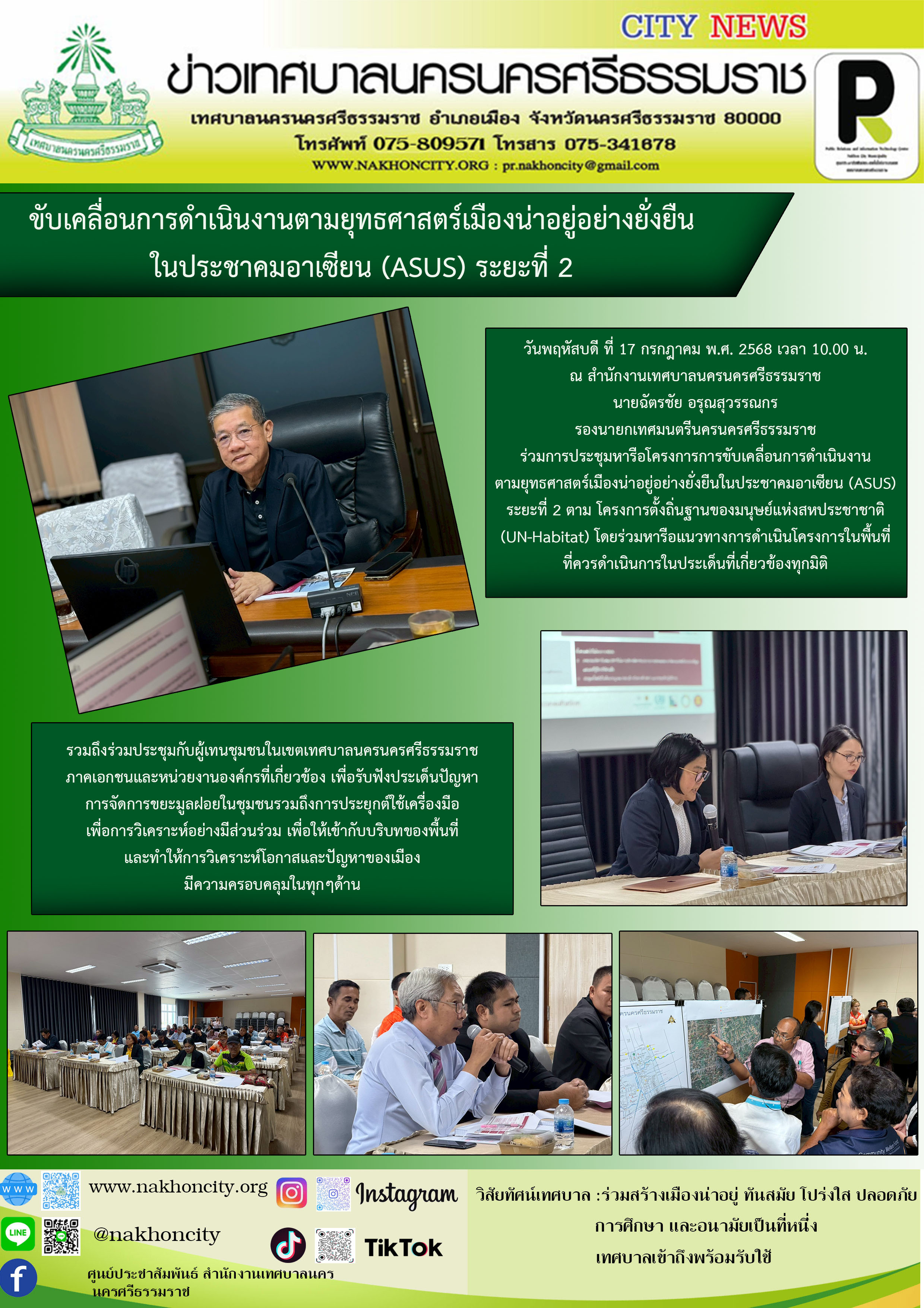 เทศบาลนครนครศรีธรรมราชและตัวแทนจากภาคเอกชนและประชาชนในพื้นที่เทศบาลและพื้นที่ใกล้เคียง เข้าร่วมประชุมกับตัวแทนจาก UN Habitat ในวันที่ 17 ก.ค.68 ภายใต้โครงการขับเคลื่อนการดำเนินงานตามยุทธศาสตร์เมืองน่าอยู่อย่างยั่งยืนในประชาคมอาเซียน (ASUS) ระยะที่2 |