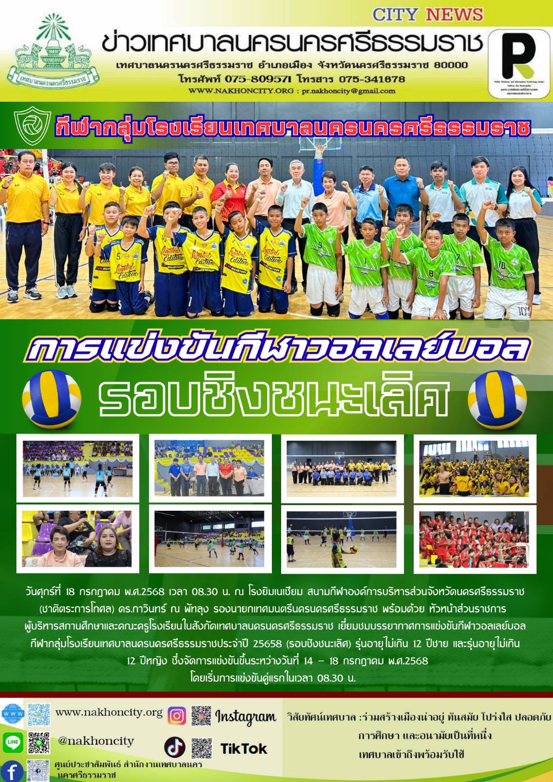 วันศุกร์ที่ 18 กรกฎาคม พ.ศ.2568 เวลา 08.30 น. ณ โรงยิมเนเซียม สนามกีฬาองค์การบริหารส่วนจังหวัดนครศรีธรรมราช (ชาติตระการโกศล) ดร.ภาวินทร์ ณ พัทลุง รองนายกเทศมนตรีนครนครศรีธรรมราช พร้อมด้วย หัวหน้าส่วนราชการ ผู้บริหารสถานศึกษาและคณะครูโรงเรียนในสังกัดเทศบาลนครนครศรีธรรมราช เยี่ยมชมบรรยากาศการแข่งขันกีฬาวอลเลย์บอล กีฬากลุ่มโรงเรียนเทศบาลนครนครศรีธรรมราช ประจำปี 25658 (รอบชิงชนะเลิศ) รุ่นอายุไม่เกิน 12 ปีชาย และรุ่นอายุไม่เกิน 12 ปีหญิง ซึ่งจัดการแข่งขันขึ้นระหว่างวันที่ 14 – 18 กรกฎาคม พ.ศ.2568 โดยเริ่มการแข่งขันคู่แรกในเวลา 08.30 น. .............. ข่าว//จันทร์จิรา ภาพ//จันทร์จิรา///แสงจันทร์ |