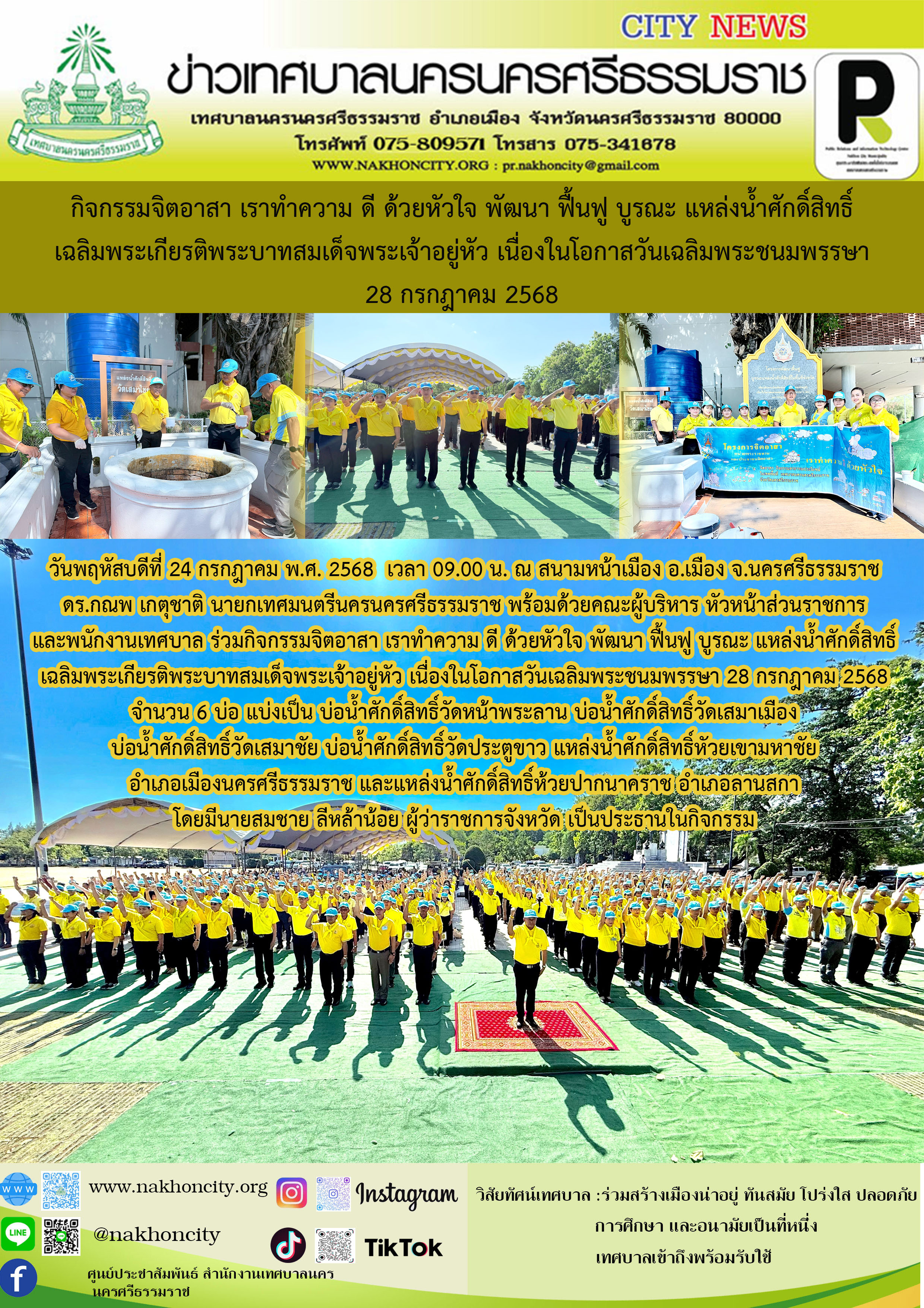 นายกเทศมนตรีนครนครศรีธรรมราช พร้อมด้วยคณะผู้บริหาร หัวหน้าส่วนราชการ และพนักงานเทศบาล ร่วมกิจกรรมจิตอาสา เราทำความ ดี ด้วยหัวใจ พัฒนา ฟื้นฟู บูรณะ แหล่งน้ำศักดิ์สิทธิ์ เฉลิมพระเกียรติพระบาทสมเด็จพระเจ้าอยู่หัว เนื่องในโอกาสวันเฉลิมพระชนมพรรษา 28 กรกฎาคม 2568 |