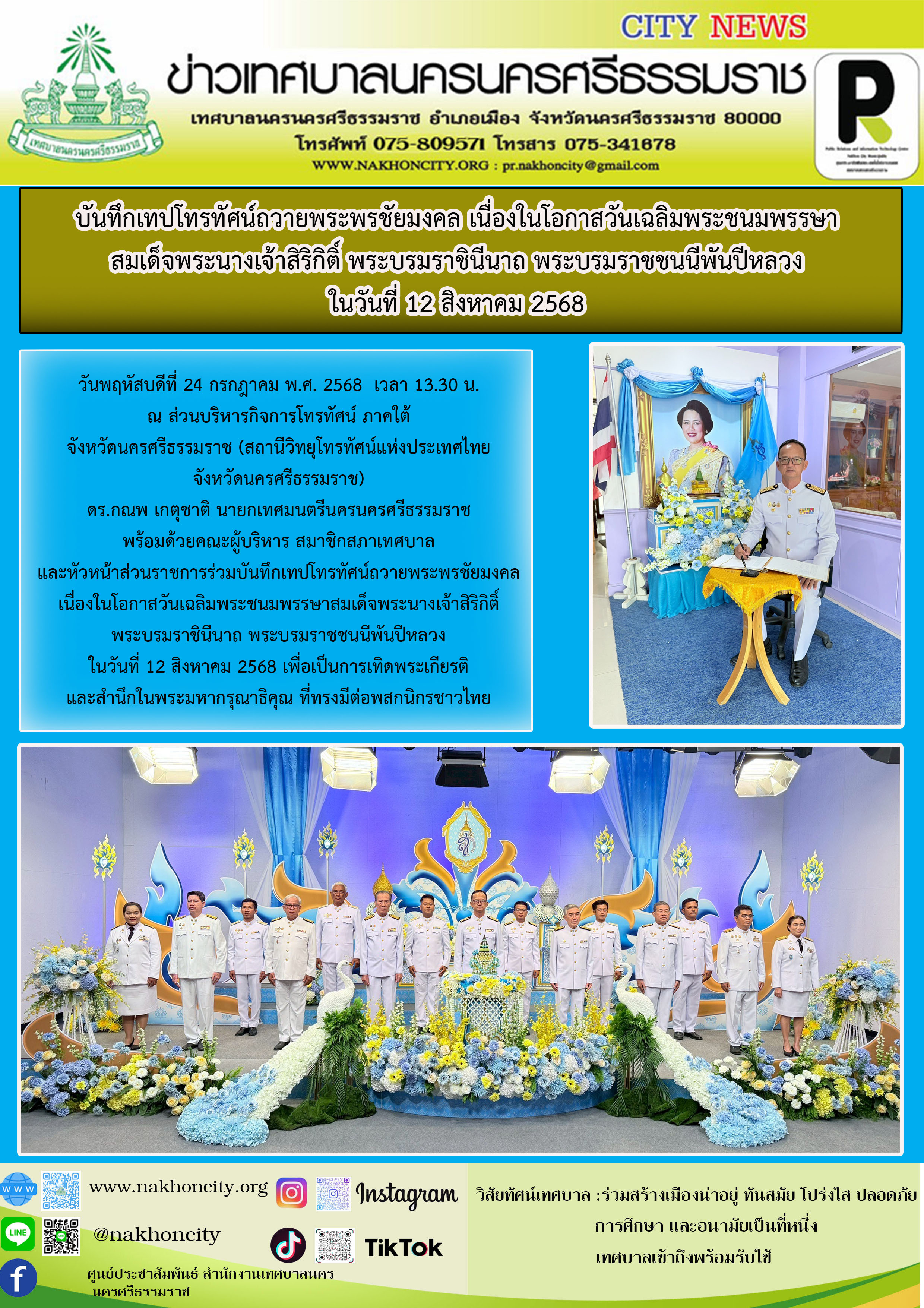 นายกเทศมนตรีนครนครศรีธรรมราช พร้อมด้วยคณะผู้บริหาร สมาชิกสภาเทศบาล และหัวหน้าส่วนราชการร่วมบันทึกเทปโทรทัศน์ถวายพระพรชัยมงคล เนื่องในโอกาสวันเฉลิมพระชนมพรรษาสมเด็จพระนางเจ้าสิริกิติ์ พระบรมราชินีนาถ พระบรมราชชนนีพันปีหลวง ในวันที่ 12 สิงหาคม 2568 |