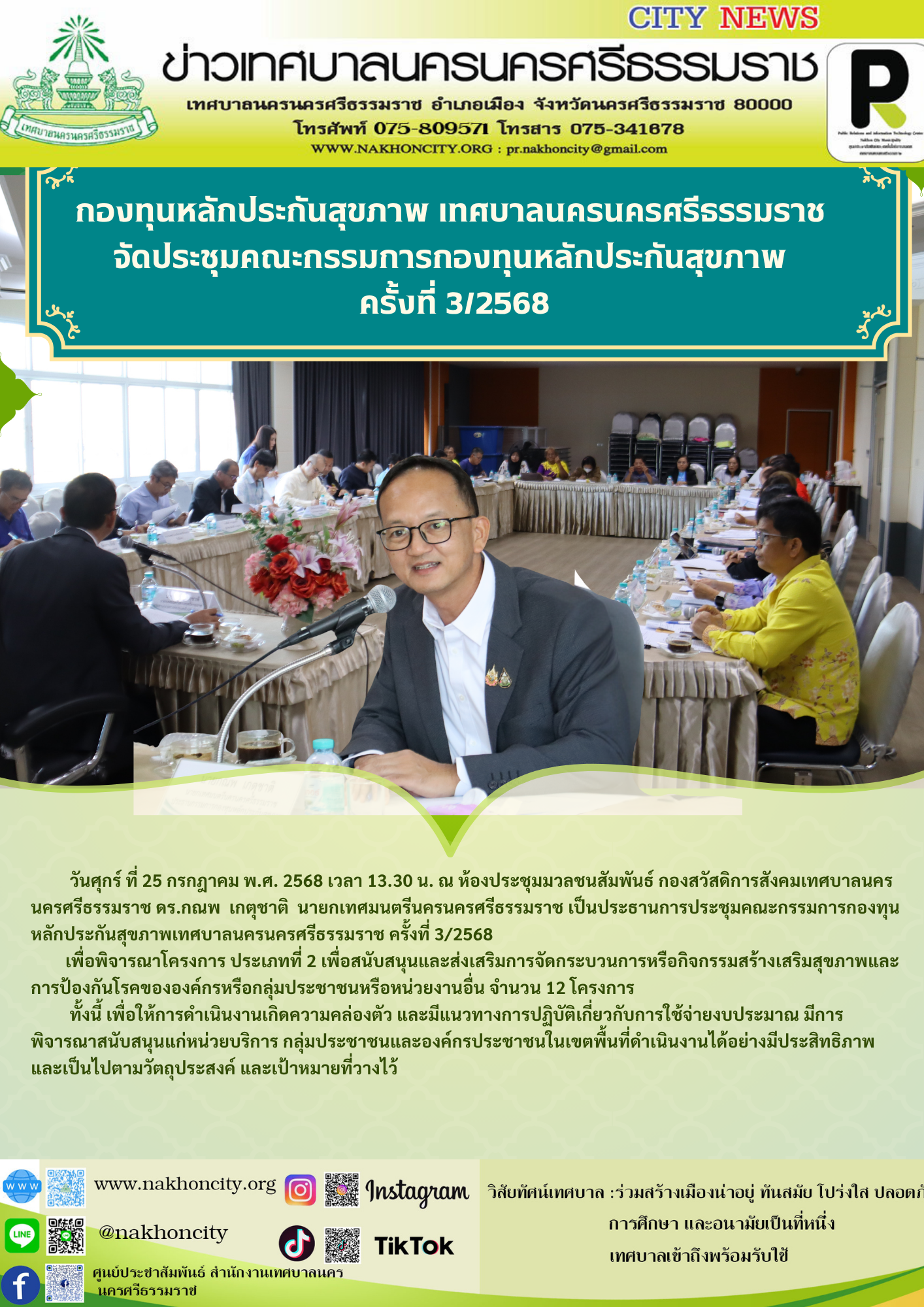 ดร.กณพ เกตุชาติ นายกเทศมนตรีนครนครศรีธรรมราช เป็นประธานการประชุมคณะกรรมการกองทุนหลักประกันสุขภาพเทศบาลนครนครศรีธรรมราช ครั้งที่ 3/2568 |