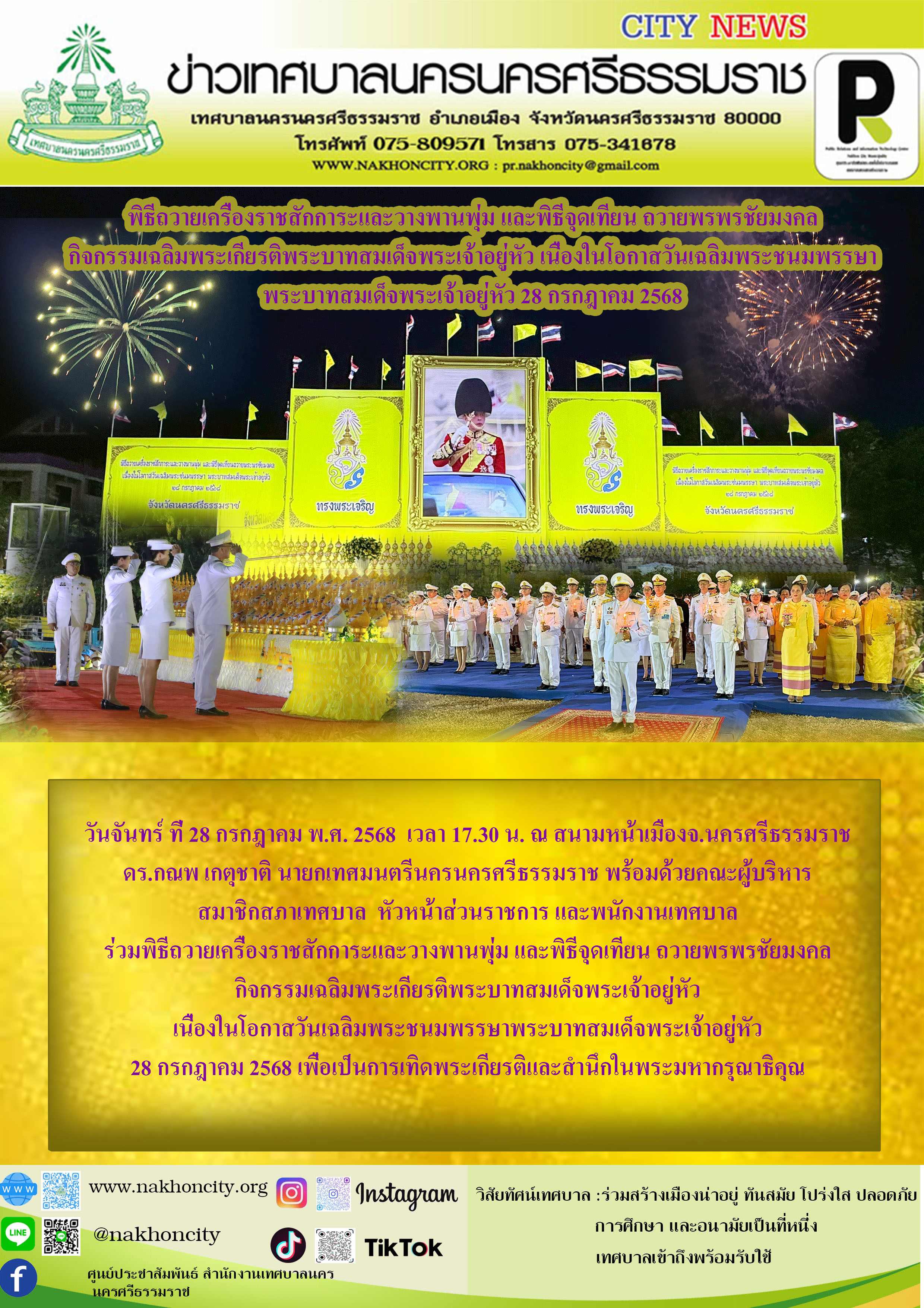 นายกเทศมนตรีนครนครศรีธรรมราช พร้อมด้วยคณะผู้บริหาร สมาชิกสภาเทศบาล หัวหน้าส่วนราชการ และพนักงานเทศบาล ร่วมพิธีถวายเครื่องราชสักการะและวางพานพุ่ม และพิธีจุดเทียนถวายพระพรชัยมงคลกิจกรรมเฉลิมพระเกียรติพระบาทสมเด็จพระเจ้าอยู่หัว เนื่องในโอกาสวันเฉลิมพระชนมพรรษาพระบาทสมเด็จพระเจ้าอยู่หัว 28 กรกฎาคม 2568 |