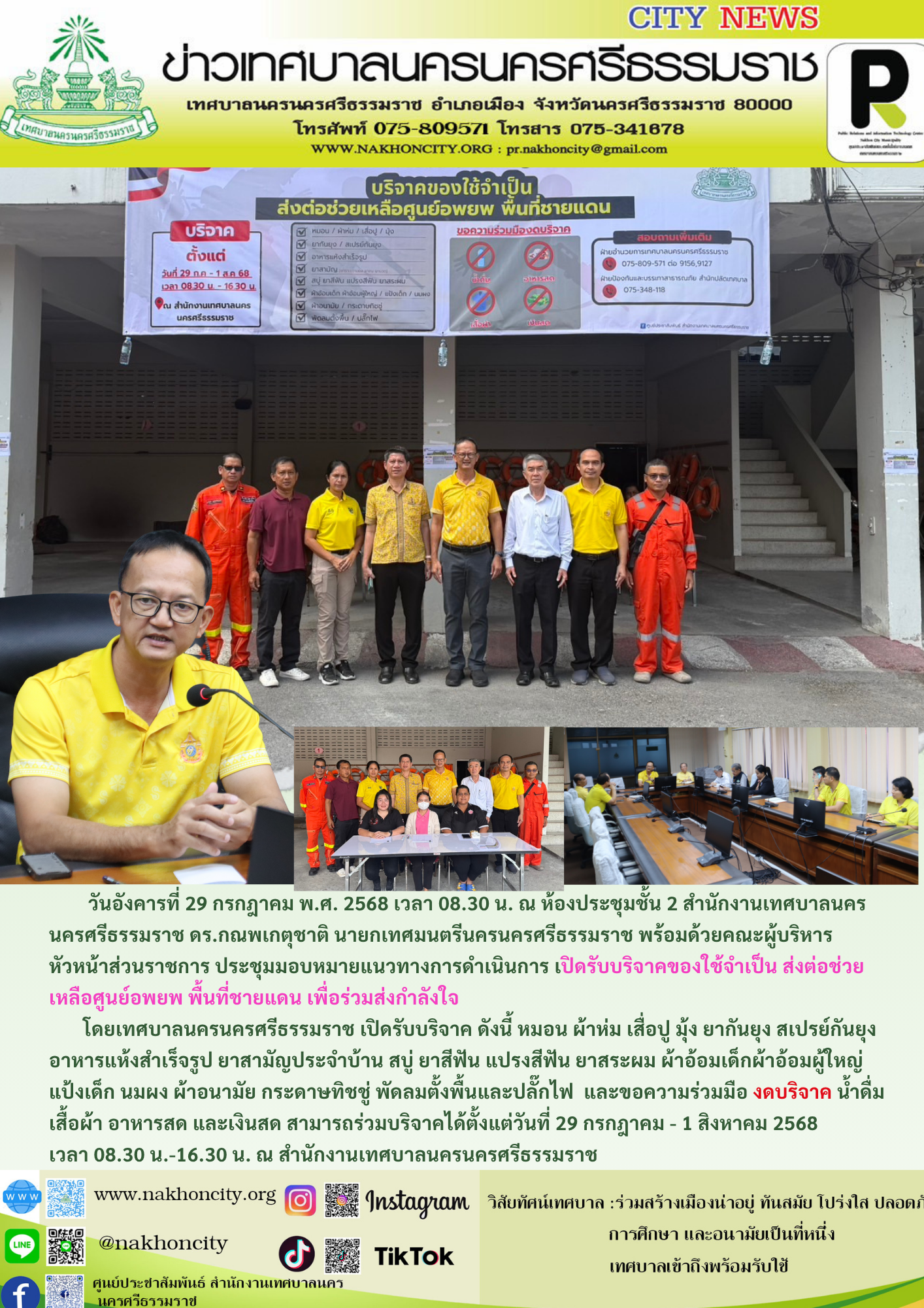 วันอังคารที่ 29 กรกฎาคม พ.ศ. 2568 เวลา 08.30 น. ณ ห้องประชุมชั้น 2 สำนักงานเทศบาลนครนครศรีธรรมราช ดร.กณพ เกตุชาติ นายกเทศมนตรีนครนครศรีธรรมราช พร้อมด้วยคณะผู้บริหาร หัวหน้าส่วนราชการ ประชุมมอบหมายแนวทางการดำเนินการเปิดรับบริจาค ของใช้จำเป็น ส่งต่อช่วยเหลือศูนย์อพยพ พื้นที่ชายแดน เพื่อร่วมส่งกำลังใจ โดยเทศบาลนครนครศรีธรรมราช เปิดรับบริจาค ดังนี้ หมอน ผ้าห่ม เสื่อปู มุ้ง ยากันยุง สเปรย์กันยุง อาหารแห้งสำเร็จรูป ยาสามัญประจำบ้าน สบู่ ยาสีฟัน แปรงสีฟัน ยาสระผม ผ้าอ้อมเด็ก ผ้าอ้อมผู้ใหญ่ แป้งเด็ก นมผง ผ้าอนามัย กระดาษทิชชู่ พัดลมตั้งพื้น และปลั๊กไฟ และขอความร่วมมือ งดบริจาค น้ำดื่ม เสื้อผ้า อาหารสด และเงินสด สามารถร่วมบริจาคได้ตั้งแต่วันที่ 29 กรกฎาคม - 1 สิงหาคม 2568 เวลา 08.30 น.-16.30 น. ณ สำนักงานเทศบาลนครนครศรีธรรมราช |