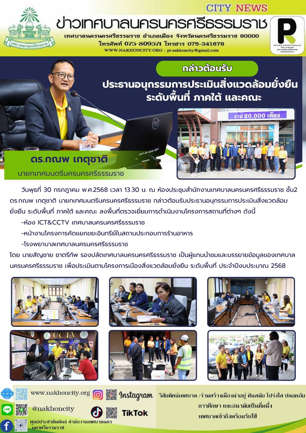 วันพุธที่ 30 กรกฎาคม พ.ศ.2568 เวลา 13.30 น. ณ ห้องประชุมสำนักงานเทศบาลนครนครศรีธรรมราช ชั้น2 ดร.กณพ เกตุชาติ นายกเทศมนตรีนครนครศรีธรรมราช กล่าวต้อนรับประธานอนุกรรมการประเมินสิ่งแวดล้อมยั่งยืน ระดับพื้นที่ ภาคใต้ และคณะ ลงพื้นที่ตรวจเยี่ยมการดำเนินงานโครงการสถานที่ต่างๆ ดังนี้