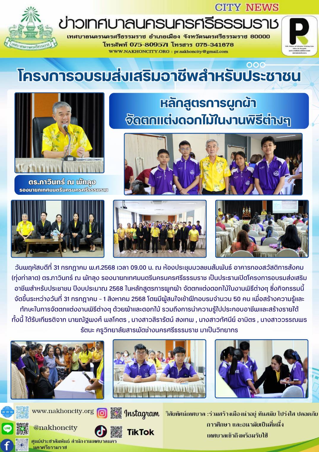 ดร.ภาวินทร์ ณ พัทลุง รองนายกเทศมนตรีนครนครศรีธรรมราช เป็นประธานเปิดโครงการอบรมส่งเสริมอาชีพสำหรับประชาชน ปีงบประมาณ 2568 |