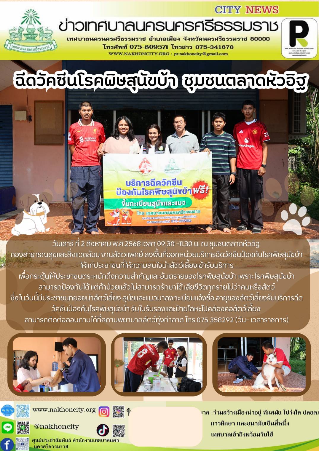 วันเสาร์ ที่ 2 สิงหาคม พ.ศ.2568 เวลา 09.30 -11.30 น. ณ ชุมชนตลาดหัวอิฐ กองสาธารณสุขและสิ่งแวดล้อม งานสัตวแพทย์ ลงพื้นที่ออกหน่วยบริการฉีดวัคซีนป้องกันโรคพิษสุนัขบ้า ให้แก่ประชาชนที่ให้ความสนใจนำสัตว์เลี้ยงเข้ารับบริการ |