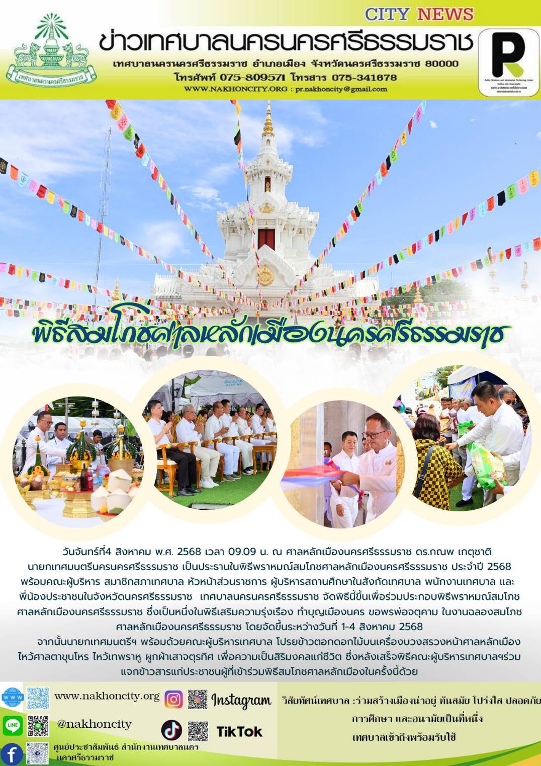 วันจันทร์ที่4 สิงหาคม พ.ศ. 2568 เวลา 09.09 น. ณ ศาลหลักเมืองนครศรีธรรมราช ดร.กณพ เกตุชาติ นายกเทศมนตรีนครนครศรีธรรมราช เป็นประธานในพิธีพราหมณ์สมโภชศาลหลักเมืองนครศรีธรรมราช ประจำปี 2568 พร้อมคณะผู้บริหาร สมาชิกสภาเทศบาล หัวหน้าส่วนราชการ ผู้บริหารสถานศึกษาในสังกัดเทศบาล พนักงานเทศบาล และพี่น้องประชาชนในจังหวัดนครศรีธรรมราช เทศบาลนครนครศรีธรรมราช จัดพิธีนี้ขึ้นเพื่อร่วมประกอบพิธีพราหมณ์สมโภชศาลหลักเมืองนครศรีธรรมราช ซึ่งเป็นหนึ่งในพิธีเสริมความรุ่งเรือง ทำบุญเมืองนคร ขอพรพ่อจตุคาม ในงานฉลองสมโภชศาลหลักเมืองนครศรีธรรมราช โดยจัดขึ้นระหว่างวันที่ 1-4 สิงหาคม 2568 |