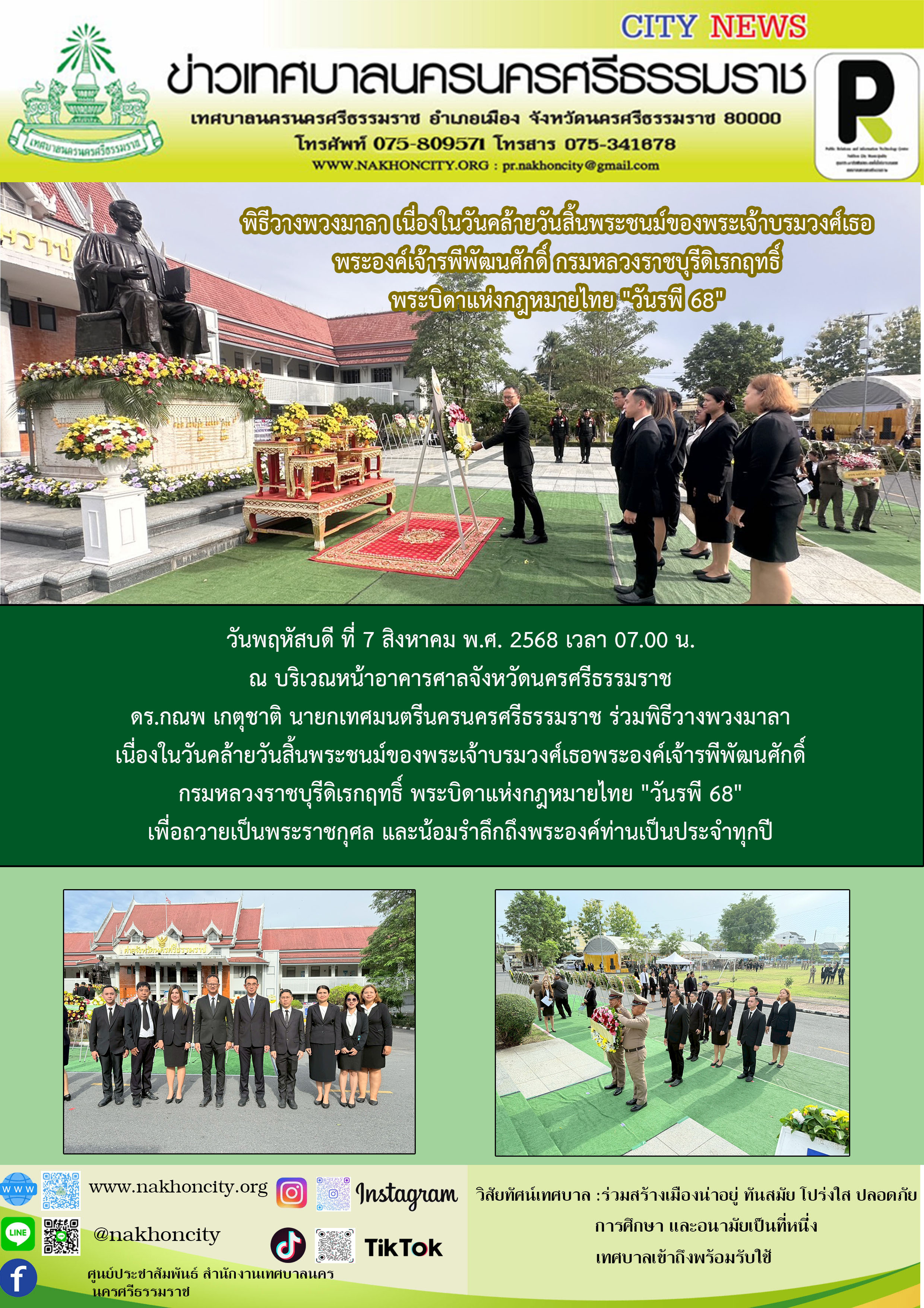 นายกเทศมนตรีนครนครศรีธรรมราช ร่วมพิธีวางพวงมาลา เนื่องในวันคล้ายวันสิ้นพระชนม์ของพระเจ้าบรมวงศ์เธอพระองค์เจ้ารพีพัฒนศักดิ์ กรมหลวงราชบุรีดิเรกฤทธิ์ พระบิดาแห่งกฎหมายไทย "วันรพี 68" |