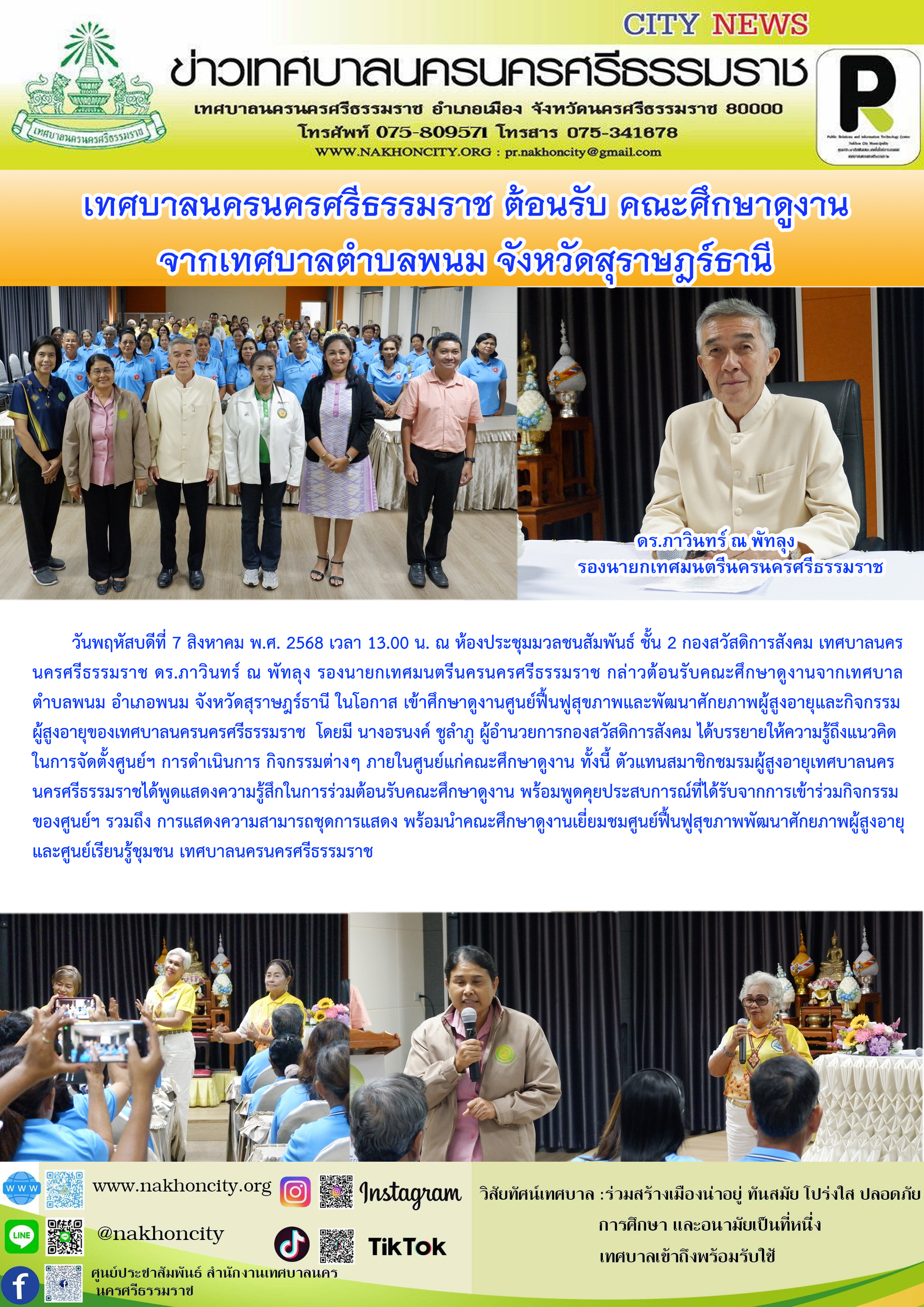 วันพฤหัสบดีที่ 7 สิงหาคม พ.ศ. 2568 เวลา 13.00 น. ณ ห้องประชุมมวลชนสัมพันธ์ ชั้น 2 กองสวัสดิการสังคม เทศบาลนครนครศรีธรรมราช ดร.ภาวินทร์ ณ พัทลุง รองนายกเทศมนตรีนครนครศรีธรรมราช กล่าวต้อนรับคณะศึกษาดูงานจากเทศบาลตำบลพนม อำเภอพนม จังหวัดสุราษฎร์ธานี ในโอกาส เข้าศึกษาดูงานศูนย์ฟื้นฟูสุขภาพและพัฒนาศักยภาพผู้สูงอายุ และกิจกรรมผู้สูงอายุของเทศบาลนครนครศรีธรรมราช โดยมี นางอรนงค์ ชูลำภู ผู้อำนวยการกองสวัสดิการสังคม ได้บรรยายให้ความรู้ถึงแนวคิดในการจัดตั้งศูนย์ฯ การดำเนินการ กิจกรรมต่างๆ ภายในศูนย์แก่คณะศึกษาดูงาน ทั้งนี้ ตัวแทนสมาชิกชมรมผู้สูงอายุเทศบาลนครนครศรีธรรมราชได้พูดแสดงความรู้สึกในการร่วมต้อนรับคณะศึกษาดูงานพร้อมพูดคุยประสบการณ์ที่ได้รับจากการเข้าร่วมกิจกรรมของศูนย์ฯ รวมถึง การแสดงความสามารถชุดการแสดง พร้อมนำคณะศึกษาดูงานได้เยี่ยมชมศูนย์ฟื้นฟูสุขภาพพัฒนาศักยภาพผู้สูงอายุและศูนย์เรียนรู้ชุมชน เทศบาลนครนครศรีธรรมราช |