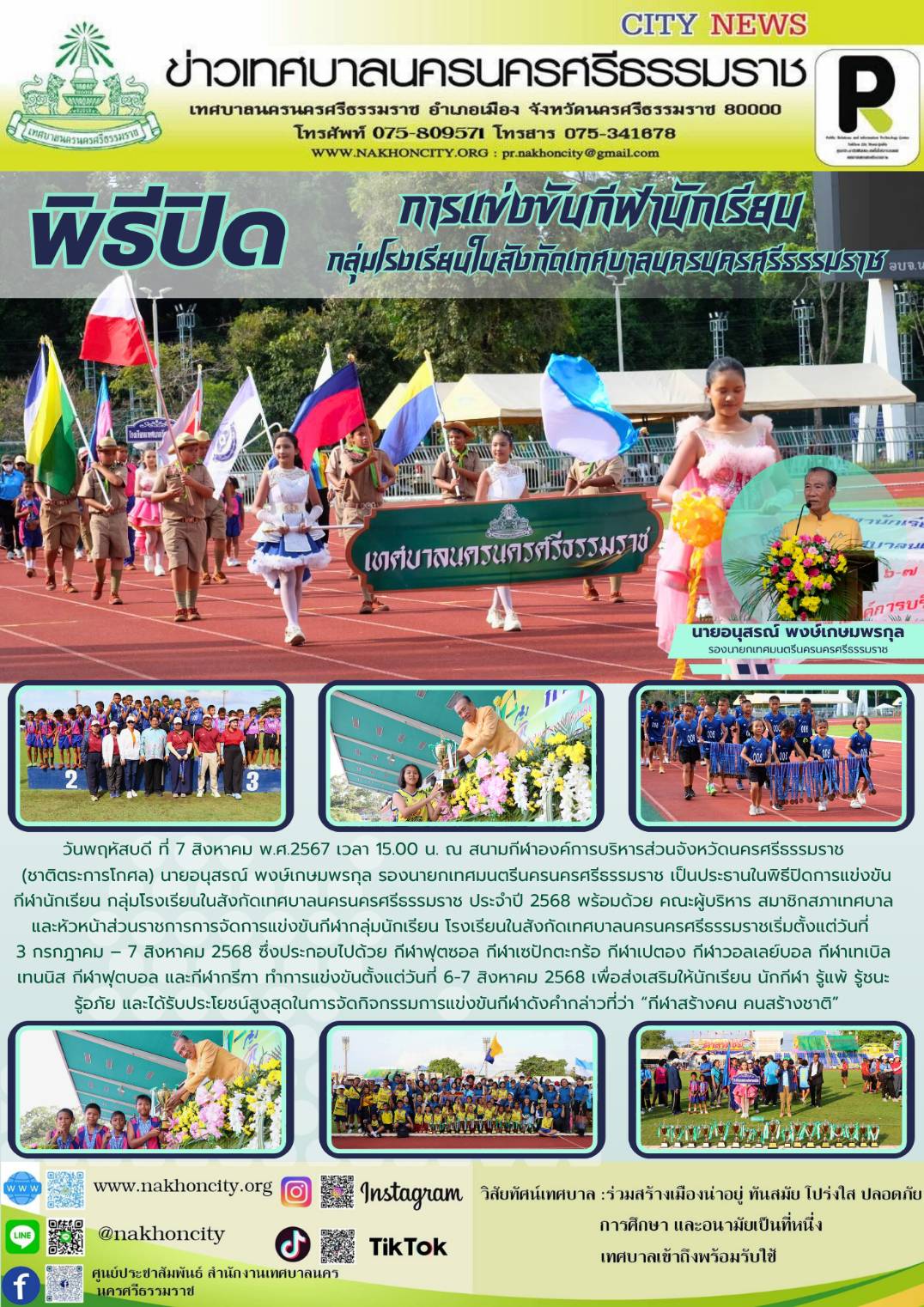 นายอนุสรณ์ พงษ์เกษมพรกุล รองนายกเทศมนตรีนครนครศรีธรรมราช พิธีปิดการแข่งขันกีฬานักเรียน กลุ่มโรงเรียนในสังกัดเทศบาลนครนครศรีธรรมราช ประจำปี 2568 |