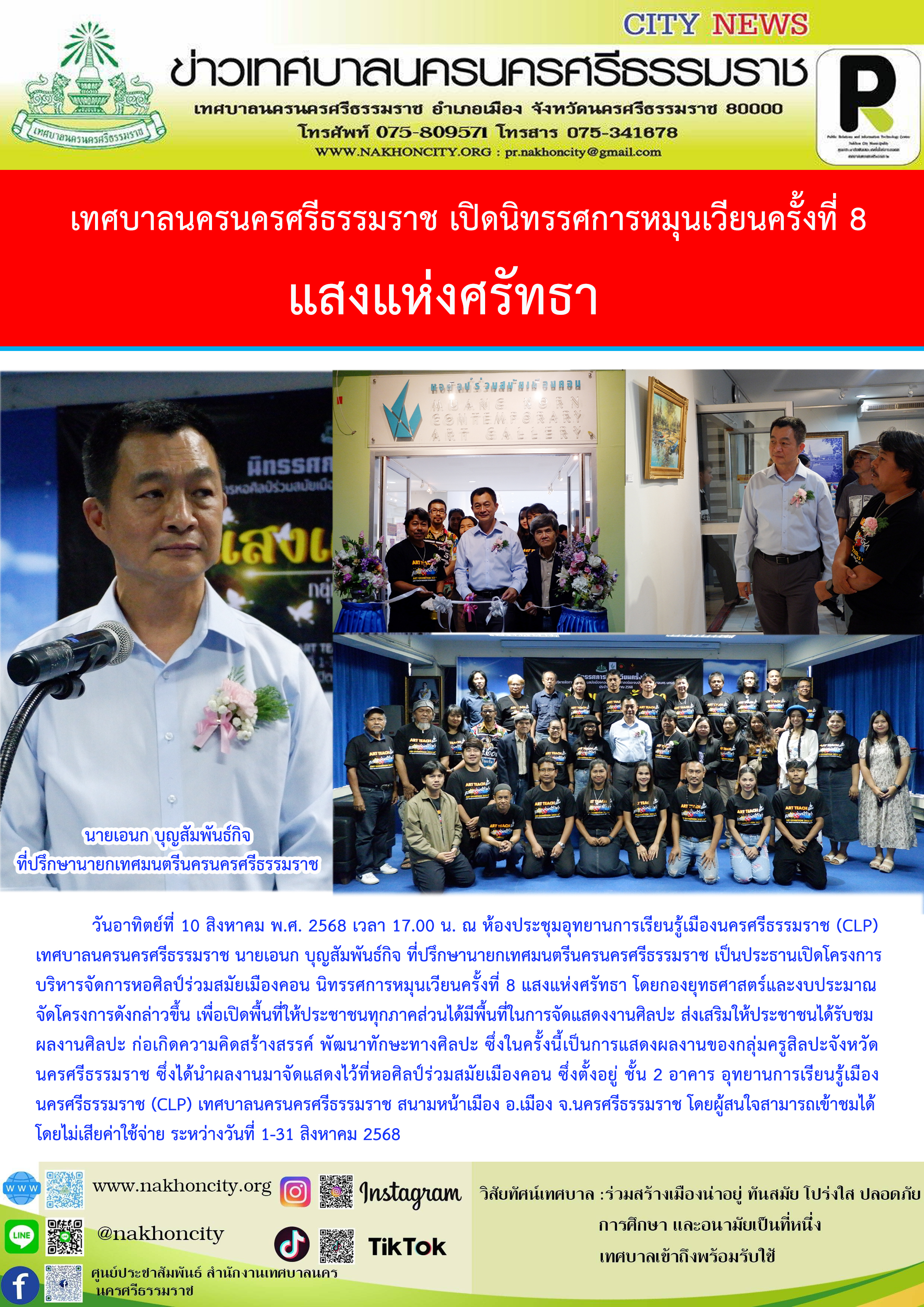 วันอาทิตย์ที่ 10 สิงหาคม พ.ศ. 2568 เวลา 17.00 น. ณ ห้องประชุมอุทยานการเรียนรู้เมืองนครศรีธรรมราช ( CLP) เทศบาลนครนครศรีธรรมราช นายเอนก บุญสัมพันธ์กิจ ที่ปรึกษานายกเทศมนตรีนครนครศรีธรรมราช เป็นประธานเปิดโครงการบริหารจัดการหอศิลป์ร่วมสมัยเมืองคอน นิทรรศการหมุนเวียนครั้งที่ 8 แสงแห่งศรัทธา โดยกองยุทธศาสตร์และงบประมาณ จัดโครงการดังกล่าวขึ้น เพื่อเปิดพื้นที่ให้ประชาชนทุกภาคส่วนได้มีพื้นที่ในการจัดแสดงงานศิลปะ ส่งเสริมให้ประชาชนได้รับชมผลงานศิลปะ ก่อเกิดความคิดสร้างสรรค์ พัฒนาทักษะทางศิลปะ ซึ่งในครั้งนี้เป็นการแสดงผลงานของกลุ่มครูสิลปะจังหวัดนครศรีธรรมราช ซึ่งได้นำผลงานมาจัดแสดงไว้ที่หอศิลป์ร่วมสมัยเมืองคอน ซึ่งตั้งอยู่ ชั้น 2 อาคาร อุทยานการเรียนรู้เมืองนครศรีธรรมราช ( CLP) เทศบาลนครนครศรีธรรมราช สนามหน้าเมือง อ.เมือง จ.นครศรีธรรมราช โดยผู้สนใจสามารถเข้าชมได้โดยไม่เสียค่าใช้จ่าย ระหว่างวันที่ 1-31 สิงหาคม 2568 |