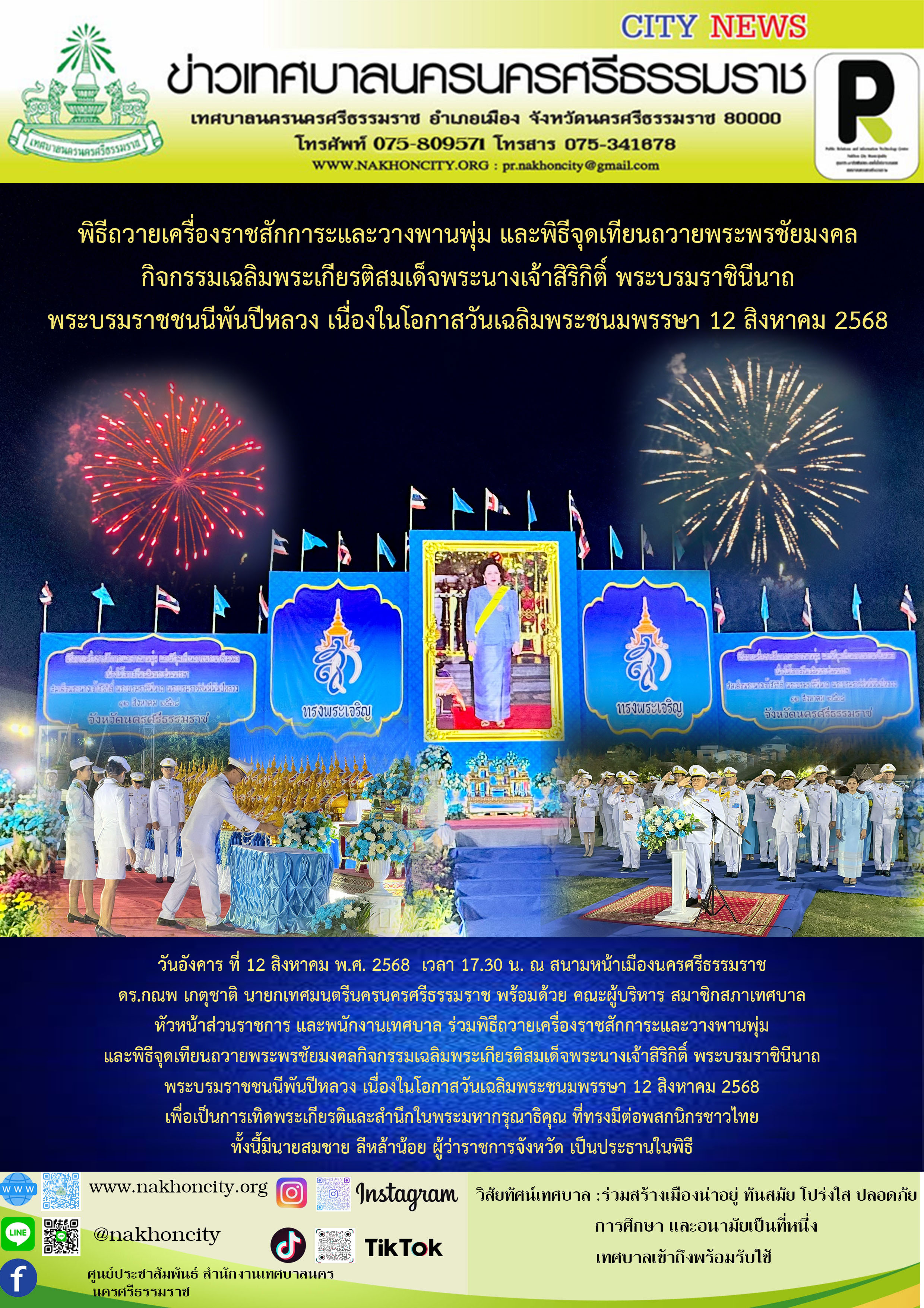 นายกเทศมนตรีนครนครศรีธรรมราช ร่วมพิธีถวายเครื่องราชสักการะและวางพานพุ่ม และพิธีจุดเทียนถวายพระพรชัยมงคลกิจกรรมเฉลิมพระเกียรติสมเด็จพระนางเจ้าสิริกิติ์ พระบรมราชินีนาถ พระบรมราชชนนีพันปีหลวง เนื่องในโอกาสวันเฉลิมพระชนมพรรษา 12 สิงหาคม 2568 |