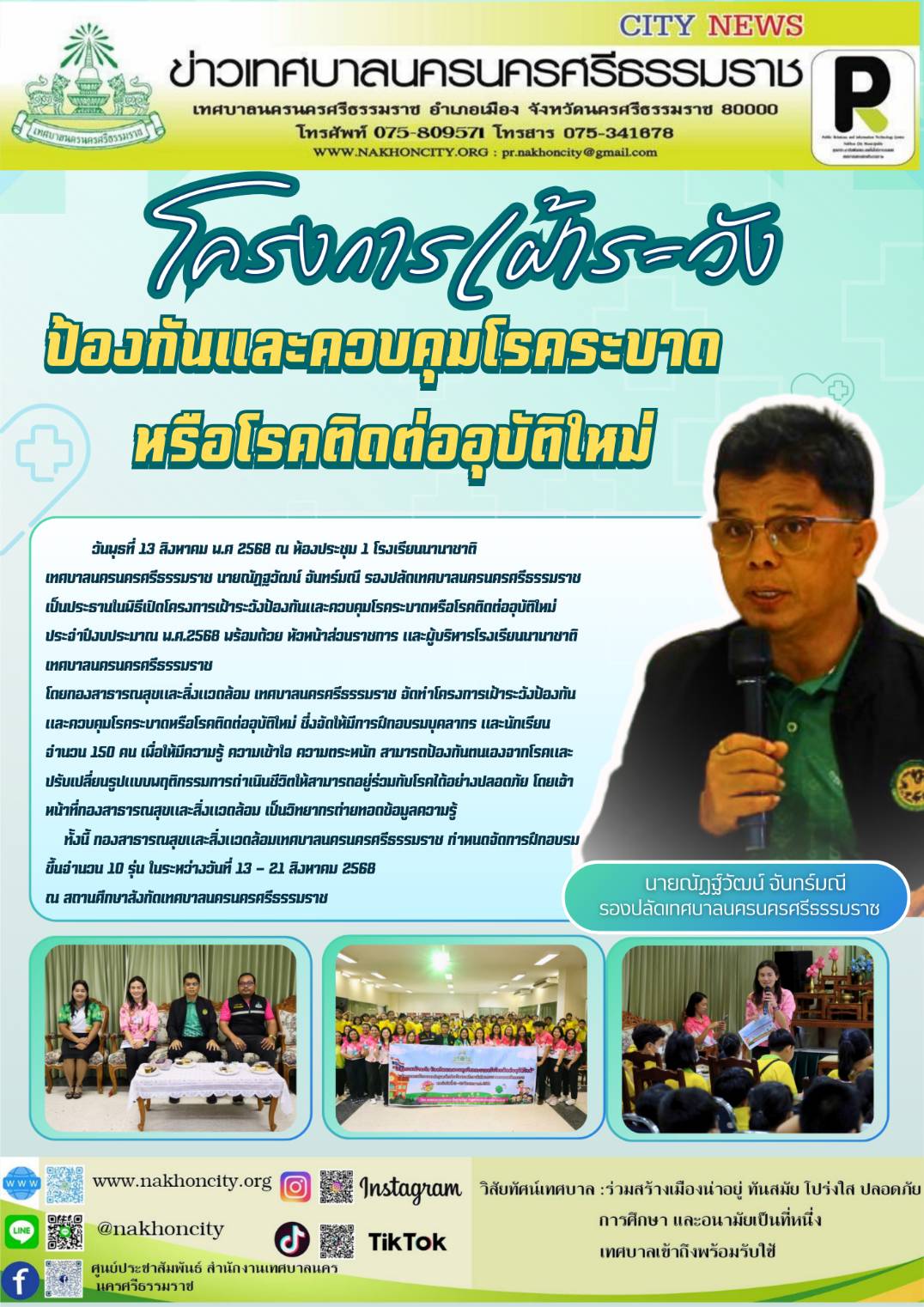 นายณัฏฐวัฒน์ จันทร์มณี รองปลัดเทศบาลนครนครศรีธรรมราช เป็นประธานในพิธีเปิดโครงการเฝ้าระวังป้องกันและควบคุมโรคระบาดหรือโรคติดต่ออุบัติใหม่ ประจำปีงบประมาณ พ.ศ.2568 |