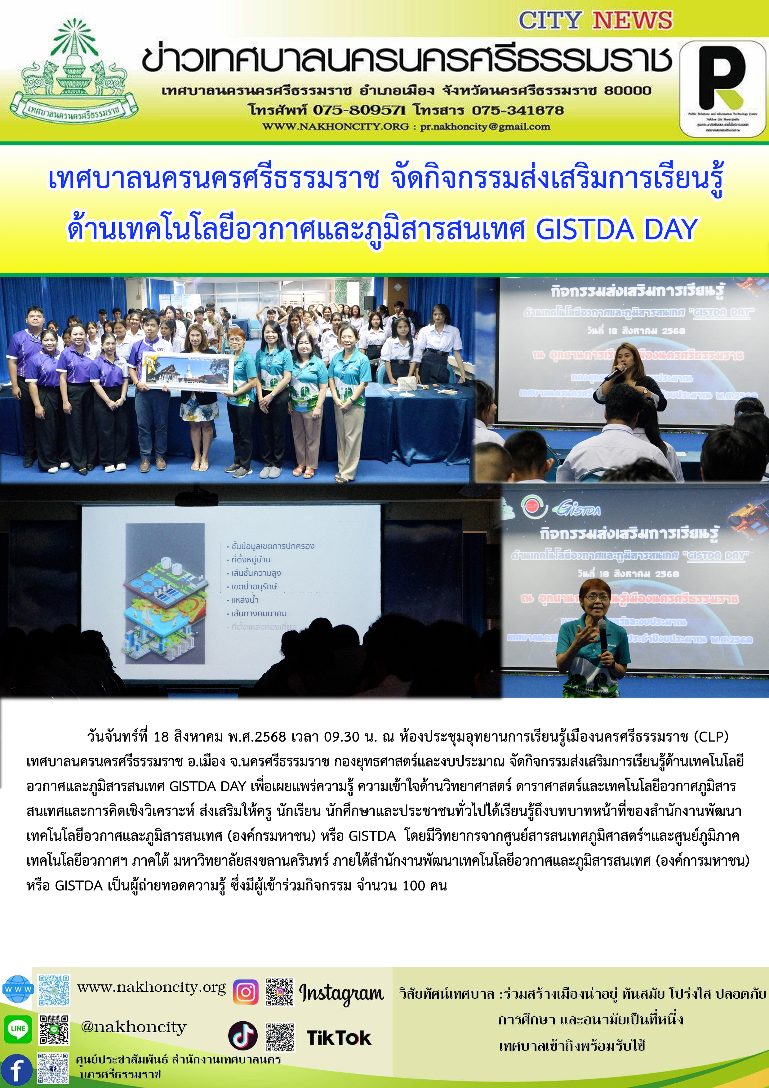 วันจันทร์ที่ 18 สิงหาคม พ.ศ. 2568 เวลา 09.30 น. ณ ห้องประชุมอุทยานการเรียนรู้เมืองนครศรีธรรมราช (CLP) เทศบาลนครนครศรีธรรมราช อ.เมือง จ.นครศรีธรรมราช กองยุทธศาสตร์และงบประมาณ จัดกิจกรรมส่งเสริมการเรียนรู้ด้านเทคโนโลยีอวกาศและภูมิสารสนเทศ GISTDA DAY เพื่อเผยแพร่ความรู้ ความเข้าใจด้านวิทยาศาสตร์ ดาราศาสตร์และเทคโนโลยีอวกาศภูมิสารสนเทศและการคิดเชิงวิเคราะห์ส่งเสริมให้ครู นักเรียน นักศึกษา และประชาชนทั่วไปได้เรียนรู้ถึงบทบาทหน้าที่ของสำนักงานพัฒนาเทคโนโลยีอวกาศและภูมิสารสนเทศ (องค์กรมหาชน) หรือ GISTDA โดยมีวิทยากรจากศูนย์สารสนเทศภูมิศาสตร์ฯและศูนย์ภูมิภาคเทคโนโลยีอวกาศฯ ภาคใต้ มหาวิทยาลัยสงขลานครินทร์ ภายใต้สำนักงานพัฒนาเทคโนโลยีอวกาศและภูมิสารสนเทศ (องค์การมหาชน) หรือ GISTDA เป็นผู้ถ่ายทอดความรู้ ซึ่งมีผู้เข้าร่วมกิจกรรม จำนวน 100 คน |