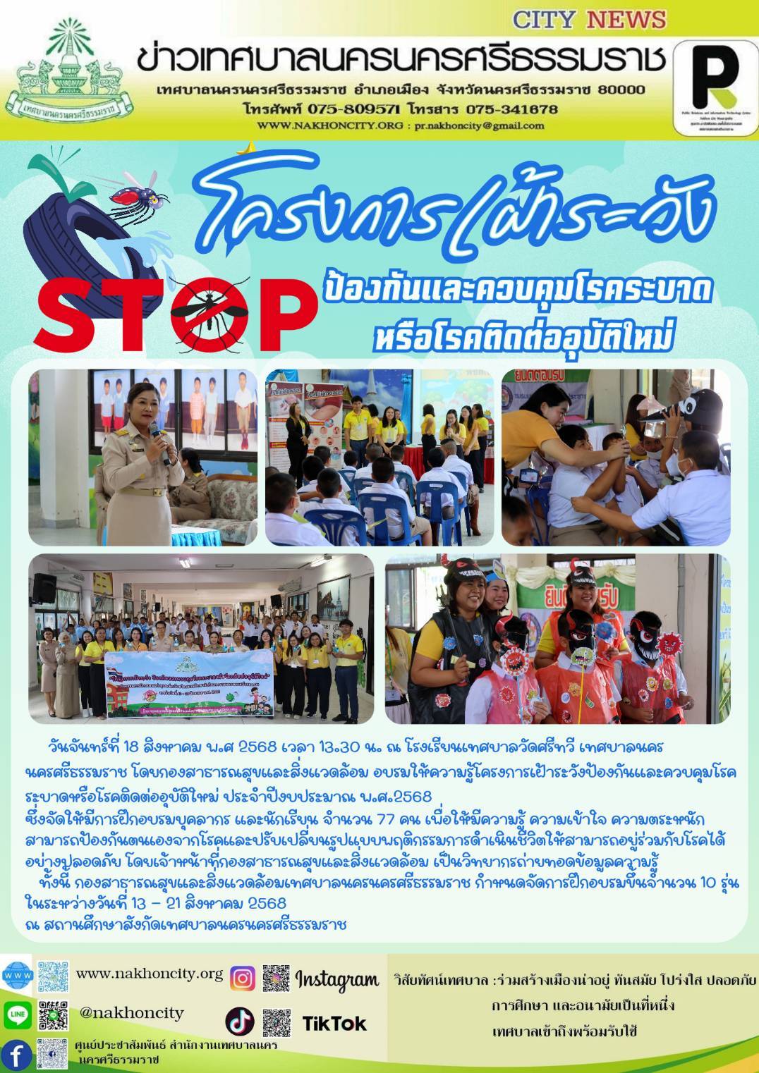 วันจันทร์ที่ 18 สิงหาคม พ.ศ 2568 เวลา 13.30 น. ณ โรงเรียนเทศบาลวัดศรีทวี เทศบาลนครนครศรีธรรมราช โดยกองสาธารณสุขและสิ่งแวดล้อม อบรมให้ความรู้โครงการเฝ้าระวังป้องกันและควบคุมโรคระบาดหรือโรคติดต่ออุบัติใหม่ ประจำปีงบประมาณ พ.ศ.2568 ซึ่งจัดให้มีการฝึกอบรมบุคลากร และนักเรียน จำนวน 77 คน เพื่อให้มีความรู้ ความเข้าใจ ความตระหนัก สามารถป้องกันตนเองจากโรคและปรับเปลี่ยนรูปแบบพฤติกรรมการดำเนินชีวิตให้สามารถอยู่ร่วมกับโรคได้อย่างปลอดภัย โดยเจ้าหน้าที่กองสาธารณสุขและสิ่งแวดล้อม เป็นวิทยากรถ่ายทอดข้อมูลความรู้ ทั้งนี้ กองสาธารณสุขและสิ่งแวดล้อมเทศบาลนครนครศรีธรรมราช กำหนดจัดการฝึกอบรมขึ้นจำนวน 10 รุ่น ในระหว่างวันที่ 13 - 21 สิงหาคม 2568 ณ สถานศึกษาสังกัดเทศบาลนครนครศรีธรรมราช ................... ภาพ//ข่าว//จันทร์จิรา |