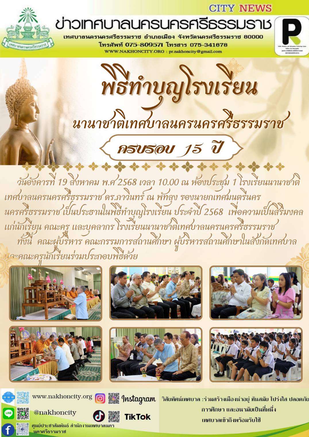 วันอังคารที่ 19 สิงหาคม พ.ศ 2568 เวลา 10.00 ณ ห้องประชุม 1 โรงเรียนนานาชาติเทศบาลนครนครศรีธรรมราช ดร.ภาวินทร์ ณ พัทลุง รองนายกเทศมนตรีนครนครศรีธรรมราช เป็นประธานในพิธีทำบุญโรงเรียน ประจำปี 2568 เพื่อความเป็นสิริมงคลแก่นักเรียน คณะครู และบุคลากร โรงเรียนนานาชาติเทศบาลนครนครศรีธรรมราช |