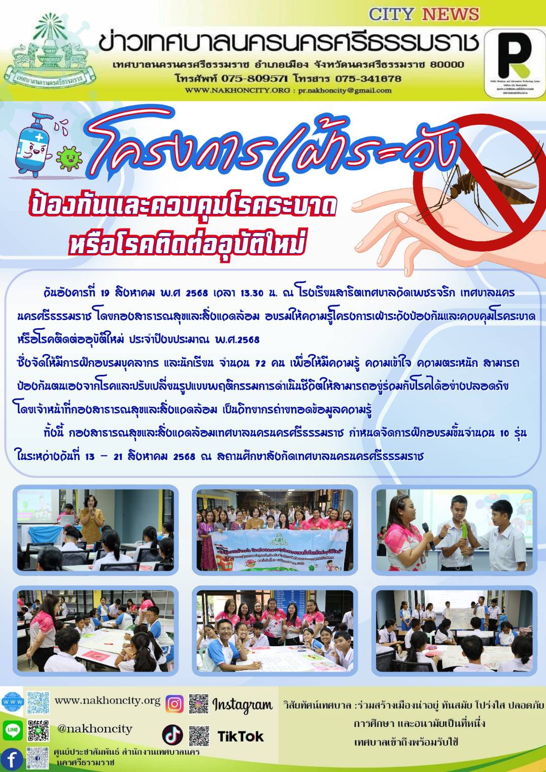 วันอังคารที่ 19 สิงหาคม พ.ศ 2568 เวลา 13.30 น. ณ โรงเรียนสาธิตเทศบาลวัดเพชรจริก เทศบาลนครนครศรีธรรมราช โดยกองสาธารณสุขและสิ่งแวดล้อม อบรมให้ความรู้โครงการเฝ้าระวังป้องกันและควบคุมโรคระบาดหรือโรคติดต่ออุบัติใหม่ ประจำปีงบประมาณ พ.ศ.2568 |