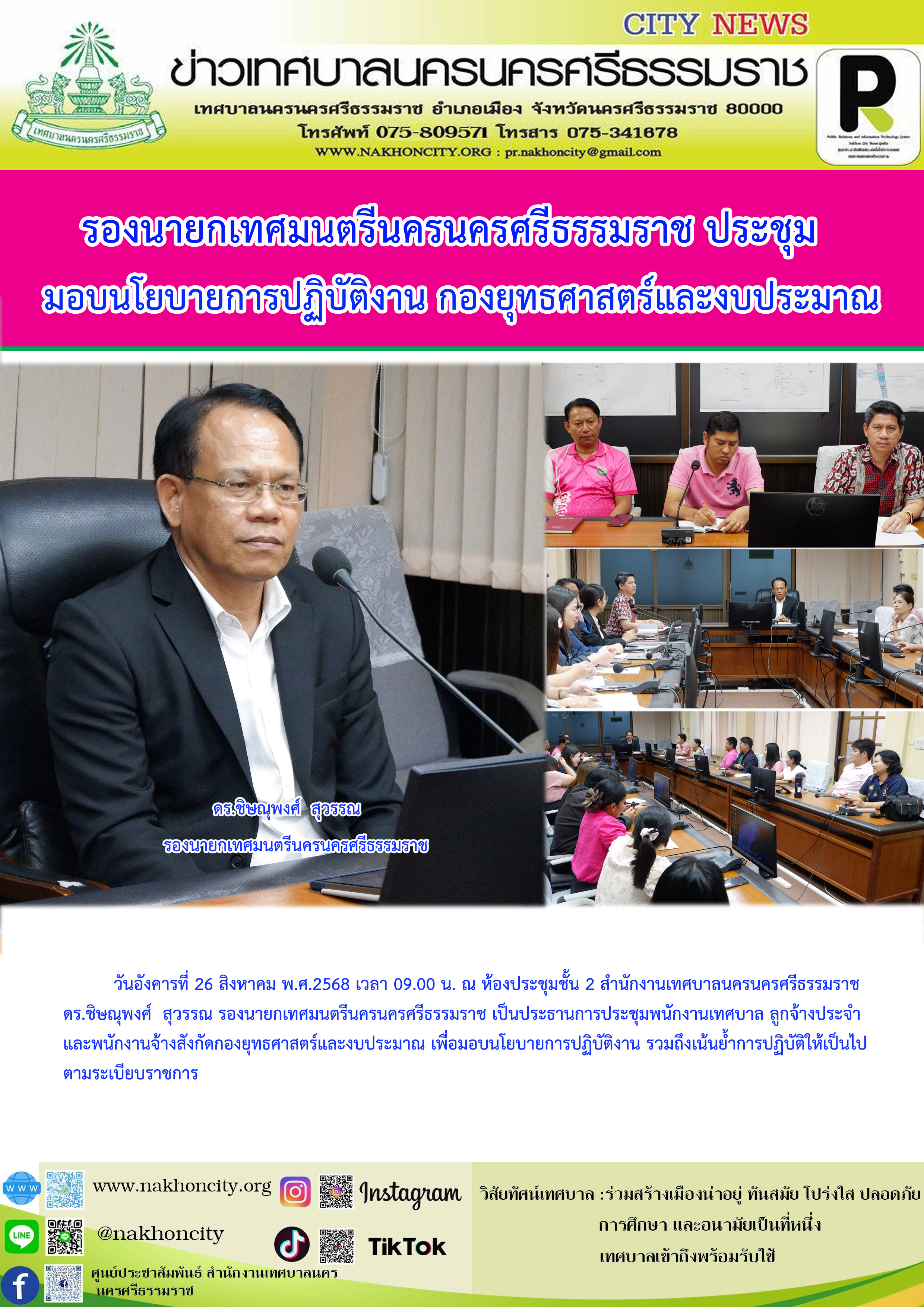 วันอังคารที่ 26 สิงหาคม พ.ศ.2568 เวลา 09.00 น. ณ ห้องประชุมชั้น 2 สำนักงานเทศบาลนครนครศรีธรรมราช ดร.ชิษณุพงศ์ สุวรรณ รองนายกเทศมนตรีนครนครศรีธรรมราช เป็นประธานการประชุมพนักงานเทศบาล ลูกจ้างประจำ และพนักงานจ้างสังกัดกองยุทธศาสตร์และงบประมาณ เพื่อมอบนโยบายการปฏิบัติงาน รวมถึงเน้นย้ำการปฏิบัติให้เป็นไปตามระเบียบราชการ |