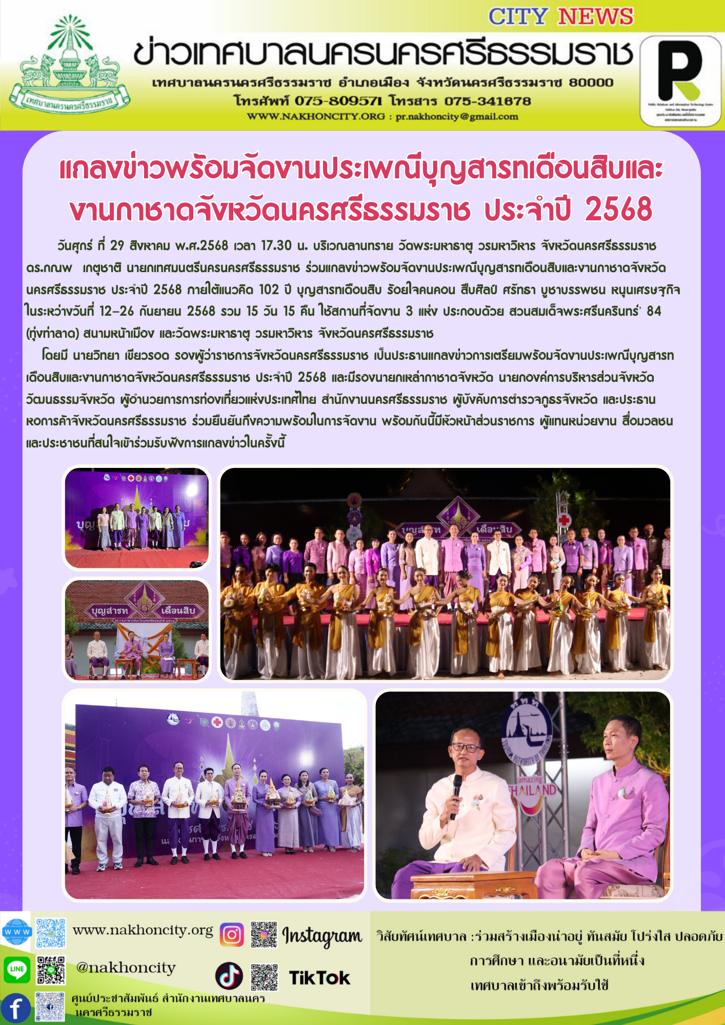 วันศุกร์ ที่ 29 สิงหาคม พ.ศ.2568 เวลา 17.30 น. บริเวณลานทราย วัดพระมหาธาตุ วรมหาวิหาร จังหวัดนครศรีธรรมราช ดร.กณพ เกตุชาติ นายกเทศมนตรีนครนครศรีธรรมราช ร่วมแถลงข่าวพร้อมจัดงานประเพณีบุญสารทเดือนสิบและงานกาชาดจังหวัดนครศรีธรรมราช ประจำปี 2568 ภายใต้แนวคิด 102 ปี บุญสารทเดือนสิบ ร้อยใจคนคอน สืบศิลป์ ศรัทธา บูชาบรรพชน หนุนเศรษฐกิจ ในระหว่างวันที่ 12-26 กันยายน 2568 รวม 15 วัน 15 คืน ใช้สถานที่จัดงาน 3 แห่ง ประกอบด้วย สวนสมเด็จพระศรีนครินทร์’ 84 (ทุ่งท่าลาด) สนามหน้าเมือง และวัดพระมหาธาตุ วรมหาวิหาร จังหวัดนครศรีธรรมราช โดยมี นายวิทยา เขียวรอด รองผู้ว่าราชการจังหวัดนครศรีธรรมราช เป็นประธานแถลงข่าวการเตรียมพร้อมจัดงานประเพณีบุญสารทเดือนสิบและงานกาชาดจังหวัดนครศรีธรรมราช ประจำปี 2568 และมีรองนายกเหล่ากาชาดจังหวัด นายกองค์การบริหารส่วนจังหวัด วัฒนธรรมจังหวัด ผู้อำนวยการการท่องเที่ยวแห่งประเทศไทย สำนักงานนครศรีธรรมราช ผู้บังคับการตำรวจภูธรจังหวัด และประธานหอการค้าจังหวัดนครศรีธรรมราช ร่วมยืนยันถึงความพร้อมในการจัดงาน พร้อมกันนี้มีหัวหน้าส่วนราชการ ผู้แทนหน่วยงาน สื่อมวลชน และประชาชนที่สนใจเข้าร่วมรับฟังการแถลงข่าวในครั้งนี้