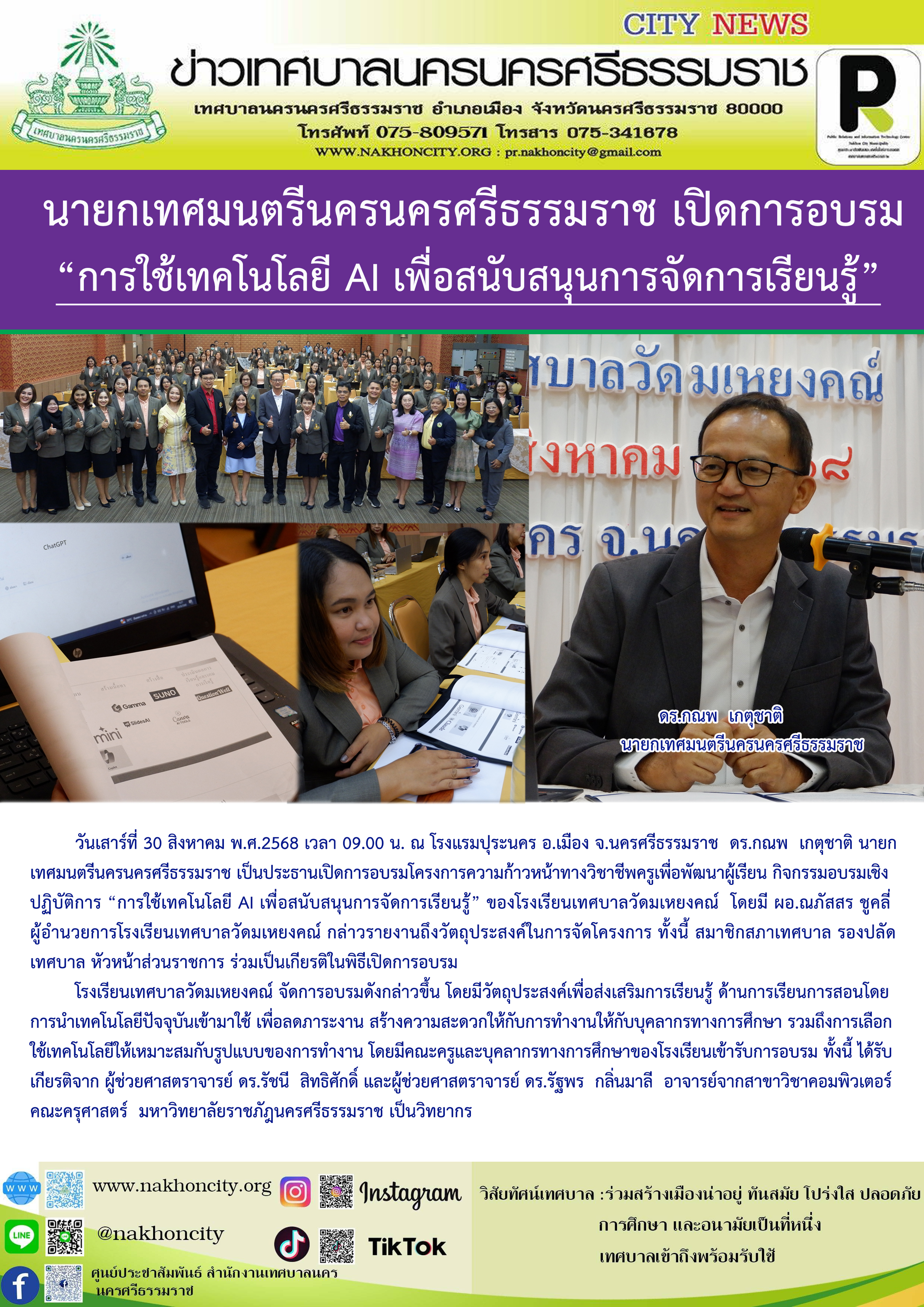 นายกเทศมนตรีนครนครศรีธรรมราช เปิดการอบรม “การใช้เทคโนโลยี AI เพื่อสนับสนุนการจัดการเรียนรู้” |
