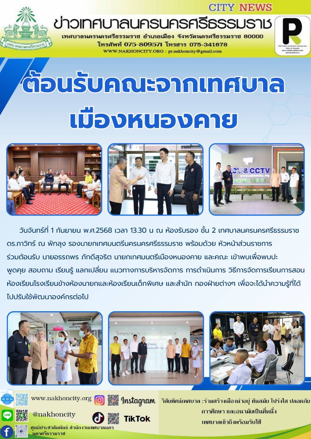 วันจันทร์ที่ 1 กันยายน พ.ศ.2568 เวลา 13.30 น ณ ห้องรับรอง ชั้น 2 เทศบาลนครนครศรีธรรมราช ดร.ภาวิทร์ ณ พัทลุง รองนายกเทศมนตรีนครนครศรีธรรมราช พร้อมด้วย หัวหน้าส่วนราชการ ร่วมต้อนรับ นายอรรถพร ภักดีสุจริต นายกเทศมนตรีเมืองหนองคาย และคณะ เข้าพบเพื่อพบปะพูดคุย สอบถาม เรียนรู้ แลกเปลี่ยน แนวทางการบริหารจัดการ การดำเนินการ วิธีการจัดการเรียนการสอน ห้องเรียนโรงเรียนข้างห้องนายกและห้องเรียนเด็กพิเศษ และสำนัก กองฝ่ายต่างๆ เพื่อจะได้นำความรู้ที่ได้ไปปรับใช้พัฒนาองค์กรต่อไป |