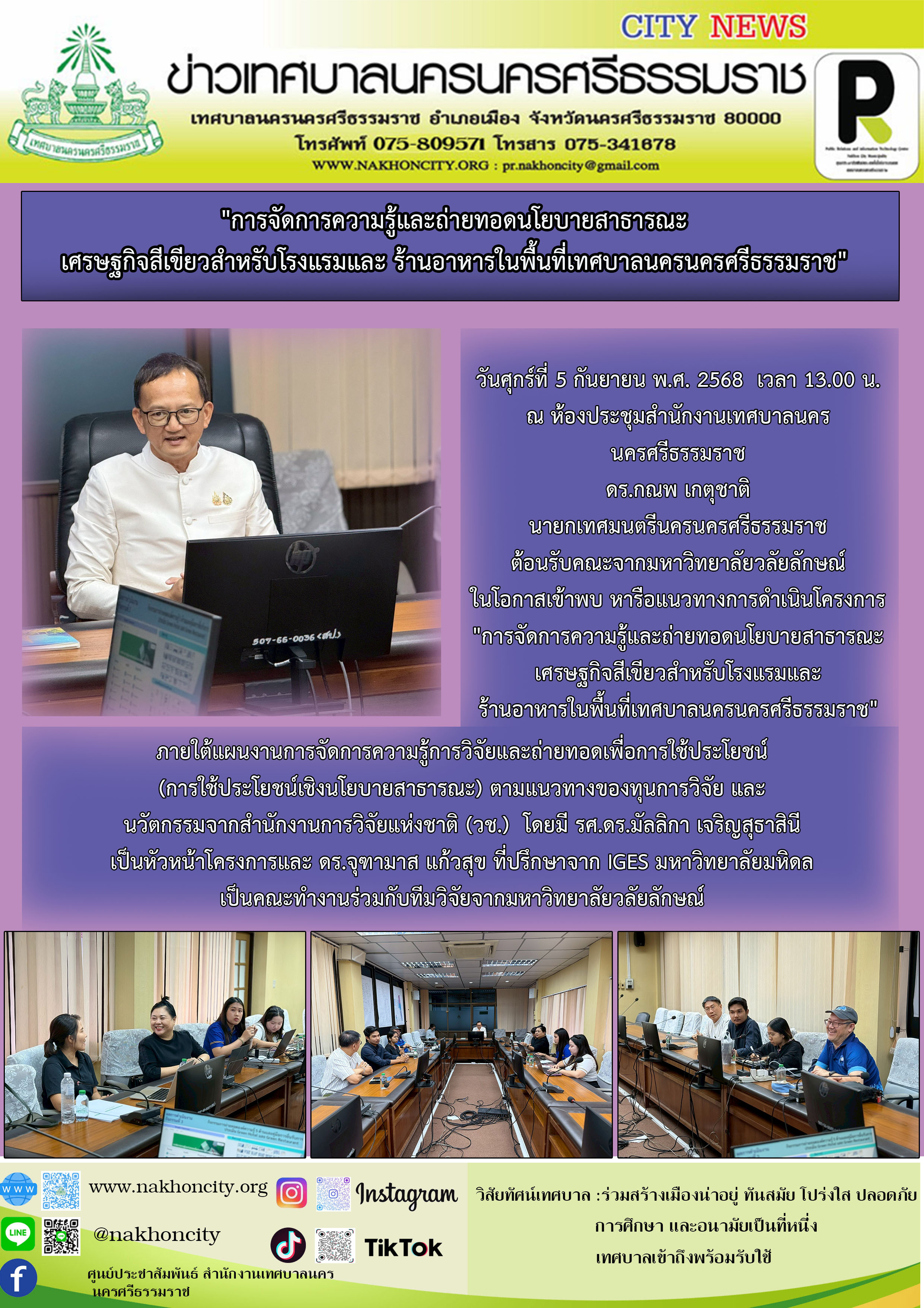 นายกเทศมนตรีนครนครศรีธรรมราช ต้อนรับคณะจากมหาวิทยาลัยวลัยลักษณ์ ในโอกาสเข้าพบ หารือแนวทางการดำเนินโครงการ "การจัดการความรู้และถ่ายทอดนโยบายสาธารณะเศรษฐกิจสีเขียวสำหรับโรงแรมและร้านอาหารในพื้นที่เทศบาลนครนครศรีธรรมราช" |
