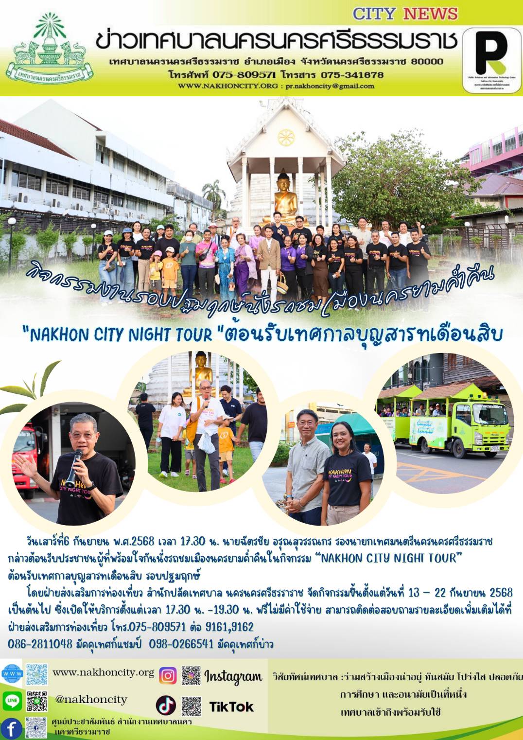 นายฉัตรชัย อรุณสุวรรณกร รองนายกเทศมนตรีนครนครศรีธรรมราช เชิญชวนประชาชนนั่งรถชมเมืองนครยามค่ำคืนในกิจกรรม “NAKHON CITY NIGHT TOUR” ต้อนรับเทศกาลบุญสารทเดือนสิบ รอบปฐมฤกษ์ |