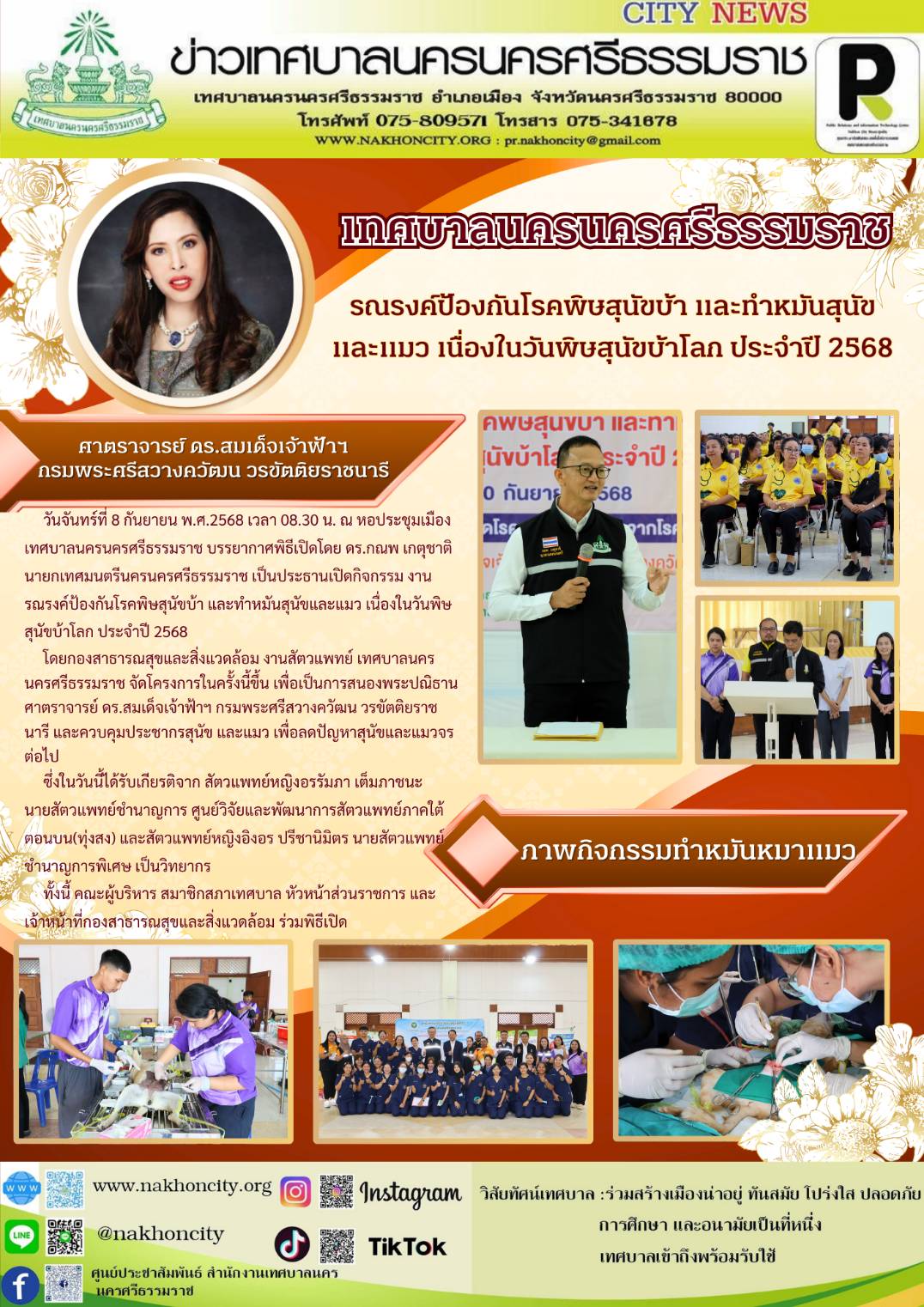 วันจันทร์ที่ 8 กันยายน พ.ศ.2568 เวลา 08.30 น. ณ หอประชุมเมืองเทศบาลนครนครศรีธรรมราช บรรยากาศพิธีเปิดโดย ดร.กณพ เกตุชาติ นายกเทศมนตรีนครนครศรีธรรมราช เป็นประธานเปิดกิจกรรม งานรณรงค์ป้องกันโรคพิษสุนัขบ้า และทำหมันสุนัขและแมว เนื่องในวันพิษสุนัขบ้าโลก ประจำปี 2568 โดยกองสาธารณสุขและสิ่งแวดล้อม งานสัตวแพทย์ เทศบาลนครนครศรีธรรมราช จัดโครงการในครั้งนี้ขึ้น เพื่อเป็นการสนองพระปณิธานศาตราจารย์ ดร.สมเด็จเจ้าฟ้าฯกรมพระศรีสวางควัฒน วรขัตติยราชนารี และควบคุมประชากรสุนัข และแมว เพื่อลดปัญหาสุนัขและแมวจรต่อไป ซึ่งในวันนี้ได้รับเกียรติจาก สัตวแพทย์หญิงอรรัมภา เต็มภาชนะ นายสัตวแพทย์ชำนาญการ ศูนย์วิจัยและพัฒนาการสัตวแพทย์ภาคใต้ตอนบน(ทุ่งสง) และสัตวแพทย์หญิงอิงอร ปรีชานิมิตร นายสัตวแพทย์ชำนาญการพิเศษ เป็นวิทยากร และได้รับเกียรติบุคลากรร่วมผ่าตัดทำหมัน ดังนี้ ปศุสัตว์จังหวัดนครศรีธรรมราช คณะอาจารย์และนักศึกษา วิทยาลัยสัตวแพทย์ศาสตร์อัครราชกุมารี มหาวิทยาลัยวลัยลักษณ์ คณะอาจารย์และนักศึกษา มหาวิทยาลัยเทคโนโลยีราชมงคลศรีวิชัย วิทยาเขตนครศรีธรรมราช ทุ่งใหญ่ คลินิกหมอฟ้ารักษาสัตว์ พระพรหม คลินิกหัวอิฐสัตวแพทย์ บ้านหมอรักษาสัตว์ พัฒน์ภัทร์สัตวแพทย์ ลานสกา คลินิกรัษาสัตว์พอว์ดี ขนอม คลินิกนาวารักษาสัตว์ ร่อนพิบูลย์ คลินิกแม่ขรี สัตวแพทย์พัทลุง ทั้งนี้ คณะผู้บริหาร สมาชิกสภาเทศบาล หัวหน้าส่วนราชการ และเจ้าหน้าที่ห้องสาธารณสุขและสิ่งแวดล้อม ร่วมพิธีเปิด .............. ภาพ//ข่าว//จันทร์จิรา |