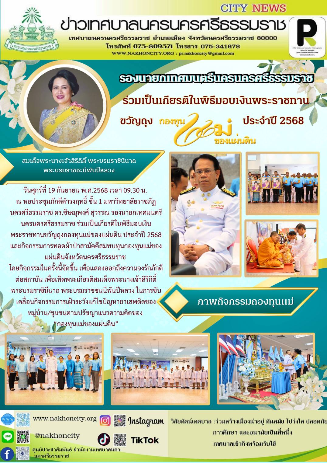 วันศุกร์ที่ 19 กันยายน พ.ศ.2568 เวลา 09.30 น. ณ หอประชุมภักดีดำรงฤทธิ์ ชั้น 1 มหาวิทยาลัยราชภัฏนครศรีธรรมราช ดร.ชิษณุพงศ์ สุวรรณ รองนายกเทศมนตรีนครนครศรีธรรมราช ร่วมเป็นเกียรติในพิธีมอบเงินพระราชทานขวัญถุงกองทุนแม่ของแผ่นดิน ประจำปี 2568 และกิจกรรมการทอดผ้าป่าสามัคคีสมทบทุนกองทุนแม่ของแผ่นดินจังหวัดนครศรีธรรมราช |
