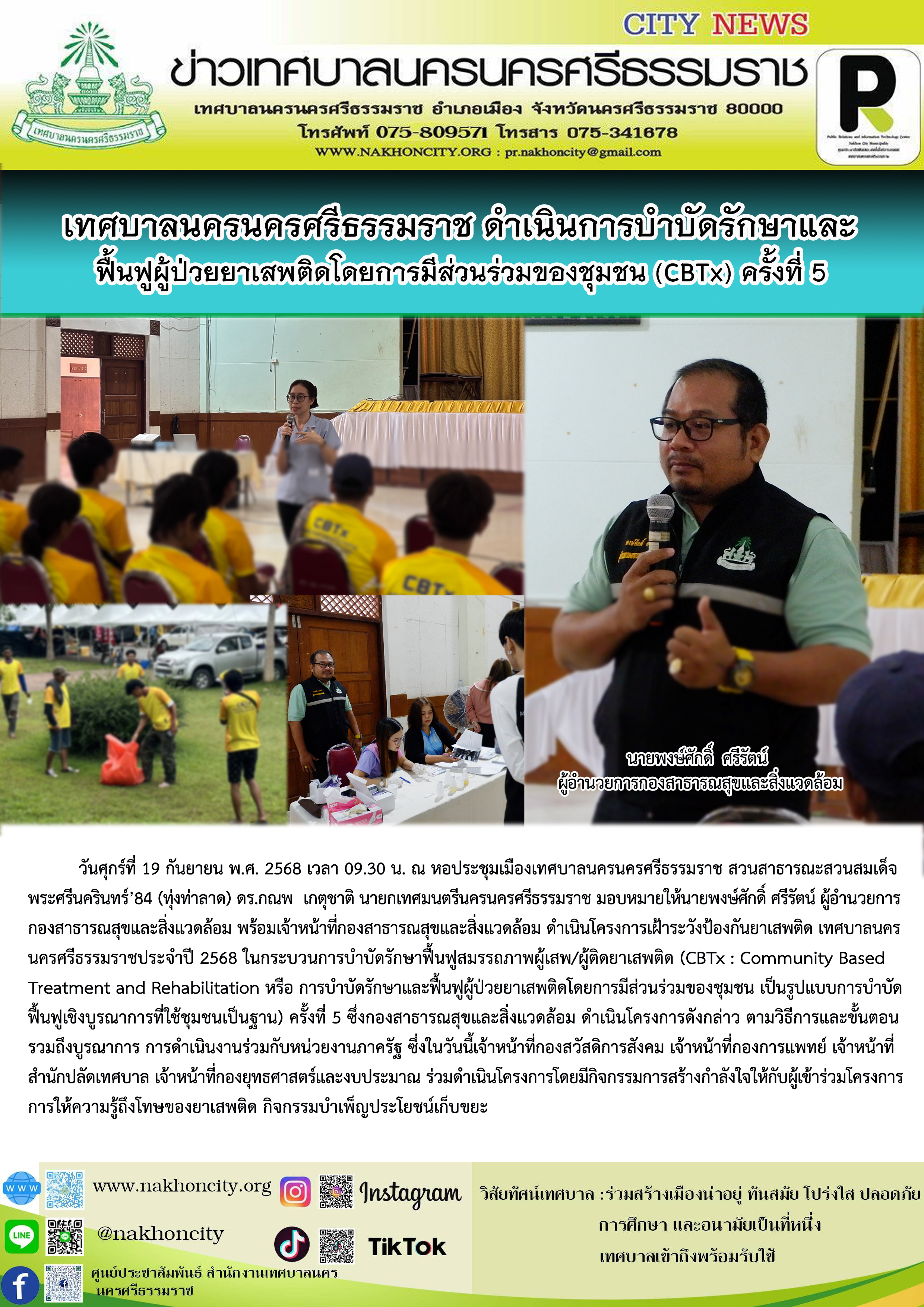 วันศุกร์ที่ 19 กันยายน พ.ศ. 2568 เวลา 09.30 น. ณ หอประชุมเมืองเทศบาลนครนครศรีธรรมราช สวนสาธารณะสวนสมเด็จพระศรีนครินทร์’84 (ทุ่งท่าลาด) ดร.กณพ เกตุชาติ นายกเทศมนตรีนครนครศรีธรรมราช มอบหมายให้นายพงษ์ศักดิ์ ศรีรัตน์ ผู้อำนวยการกองสาธารณสุขและสิ่งแวดล้อม พร้อมเจ้าหน้าที่กองสาธารณสุขและสิ่งแวดล้อม ดำเนินโครงการเฝ้าระวังป้องกันยาเสพติด เทศบาลนครนครศรีธรรมราชประจำปี 2568 ในกระบวนการบำบัดรักษาฟื้นฟูสมรรถภาพผู้เสพ/ผู้ติดยาเสพติด (CBTx : Community Based Treatment and Rehabilitation หรือ การบำบัดรักษาและฟื้นฟูผู้ป่วยยาเสพติดโดยการมีส่วนร่วมของชุมชน เป็นรูปแบบการบำบัดฟื้นฟูเชิงบูรณาการที่ใช้ชุมชนเป็นฐาน) ครั้งที่ 5 ซึ่งกองสาธารณสุขและสิ่งแวดล้อม ดำเนินโครงการดังกล่าว ตามวิธีการและขั้นตอน รวมถึงบูรณาการ การดำเนินงานร่วมกับหน่วยงานภาครัฐ ซึ่งในวันนี้เจ้าหน้าที่กองสวัสดิการสังคม เจ้าหน้าที่กองการแพทย์ เจ้าหน้าที่สำนักปลัดเทศบาล เจ้าหน้าที่กองยุทธศาสตร์และงบประมาณ ร่วมดำเนินโครงการโดยมีกิจกรรมการสร้างกำลังใจให้กับผู้เข้าร่วมโครงการ การให้ความรู้ถึงโทษของยาเสพติด กิจกรรมบำเพ็ญประโยชน์เก็บขยะ