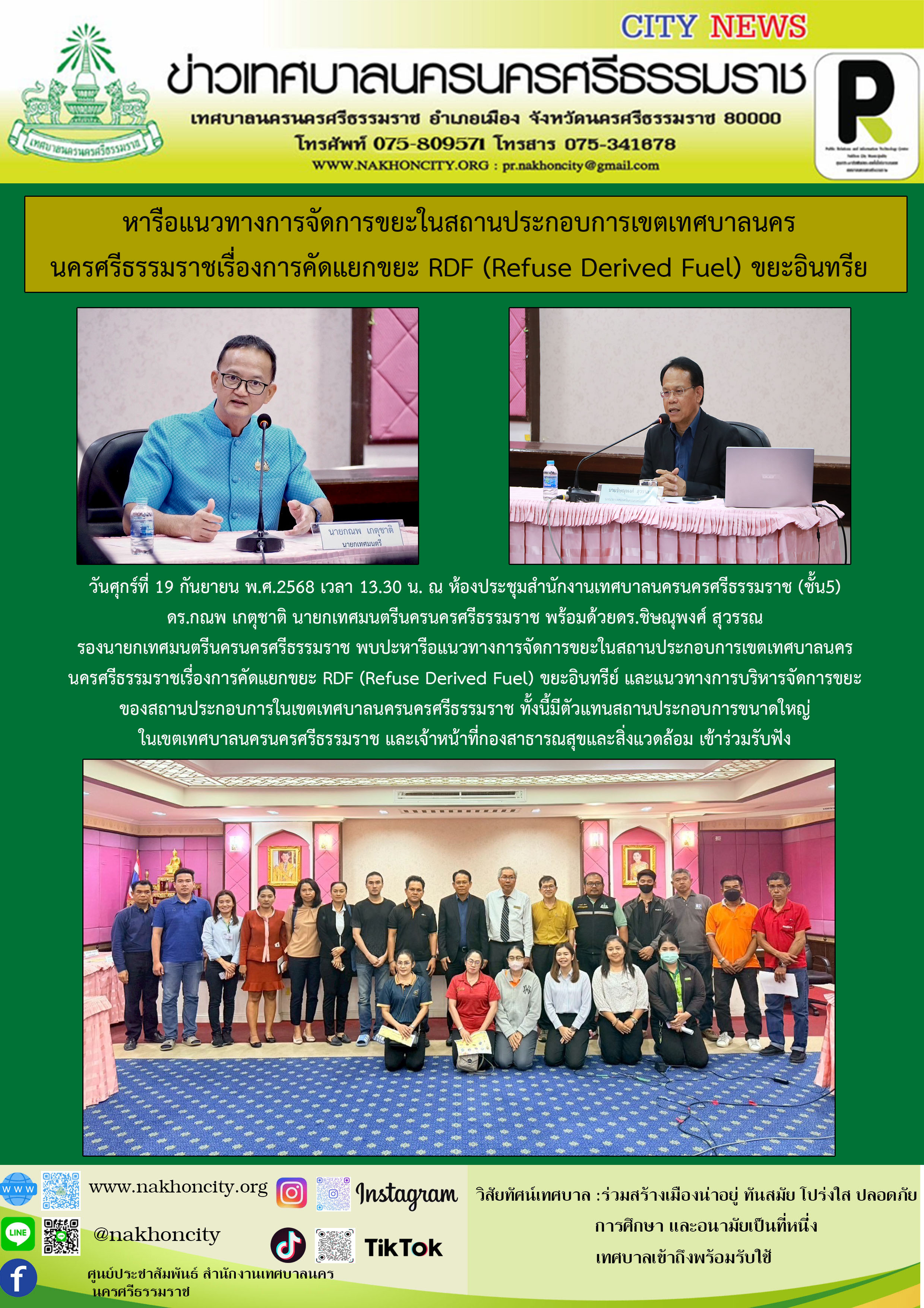 นายกเทศมนตรีนครนครศรีธรรมราช พร้อมด้วยดร.ชิษณุพงศ์ สุวรรณ รองนายกเทศมนตรีนครนครศรีธรรมราช พบปะหารือแนวทางการจัดการขยะในสถานประกอบการเขตเทศบาลนครนครศรีธรรมราชเรื่องการคัดแยกขยะ RDF (Refuse Derived Fuel) ขยะอินทรีย์ |