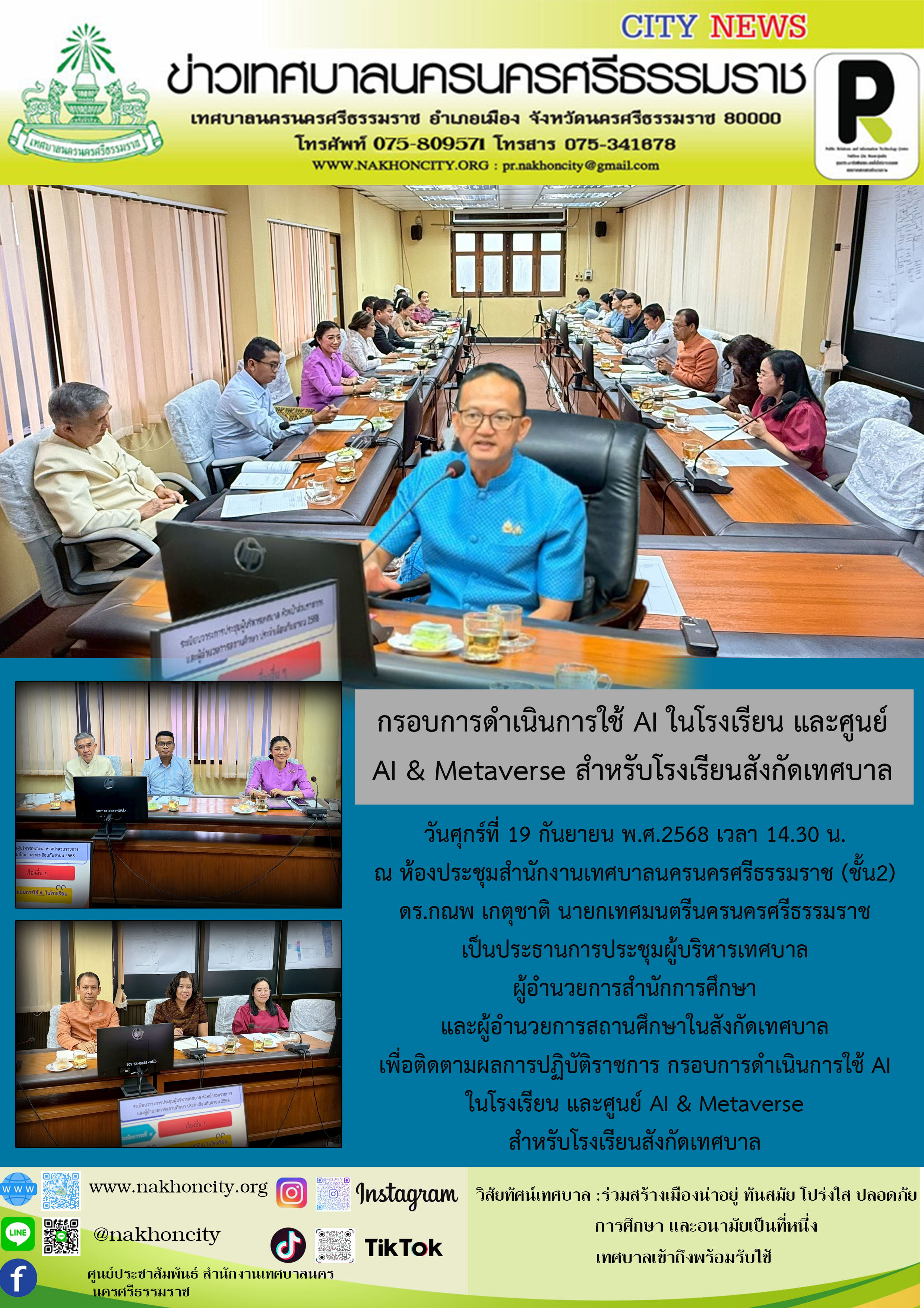 นายกเทศมนตรีนครนครศรีธรรมราช เป็นประธานการประชุมผู้บริหารเทศบาล ผู้อำนวยการสำนักการศึกษา และผู้อำนวยการสถานศึกษาในสังกัดเทศบาล เพื่อติดตามผลการปฏิบัติราชการ กรอบการดำเนินการใช้ AI ในโรงเรียน และศูนย์ AI & Metaverse สำหรับโรงเรียนสังกัดเทศบาล |