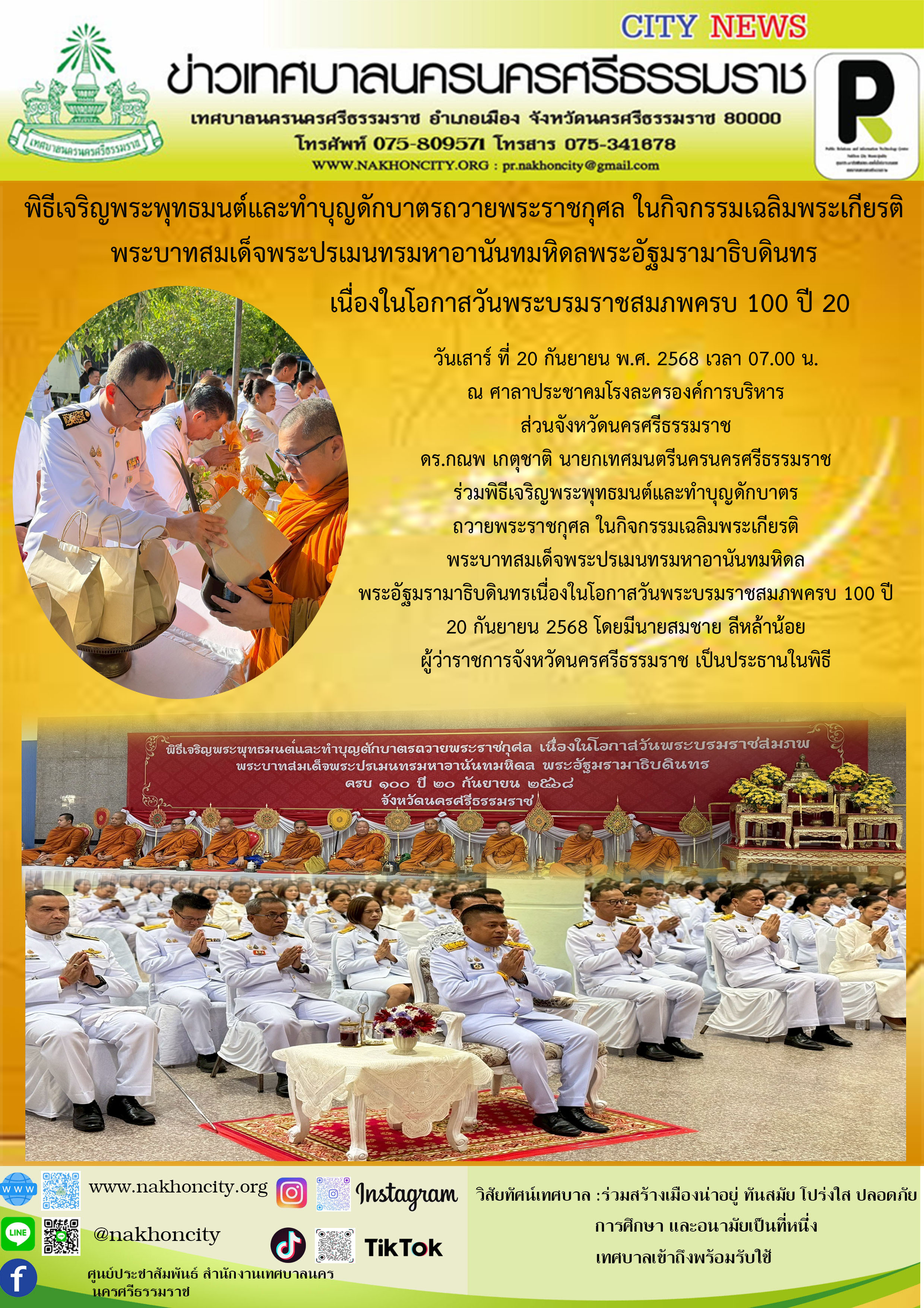 นายกเทศมนตรีนครนครศรีธรรมราช ร่วมพิธีเจริญพระพุทธมนต์และทำบุญดักบาตรถวายพระราชกุศล ในกิจกรรมเฉลิมพระเกียรติ พระบาทสมเด็จพระปรเมนทรมหาอานันทมหิดล พระอัฐมรามาธิบดินทรเนื่องในโอกาสวันพระบรมราชสมภพครบ 100 ปี 20 กันยายน 2568 |