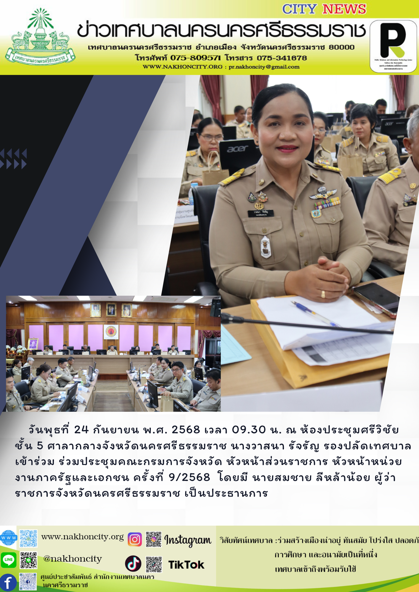 วันพุธที่ 24 กันยายน พ.ศ. 2568 เวลา 09.30 น. ณ ห้องประชุมศรีวิชัย ชั้น 5 ศาลากลางจังหวัดนครศรีธรรมราช นางวาสนา รัจรัญ รองปลัดเทศบาล เข้าร่วม ร่วมประชุมคณะกรมการจังหวัด หัวหน้าส่วนราชการ หัวหน้าหน่วยงานภาครัฐและเอกชน ครั้งที่ 9/2568 โดยมี นายสมชาย ลีหล้าน้อย ผู้ว่าราชการจังหวัดนครศรีธรรมราช เป็นประธานการ |