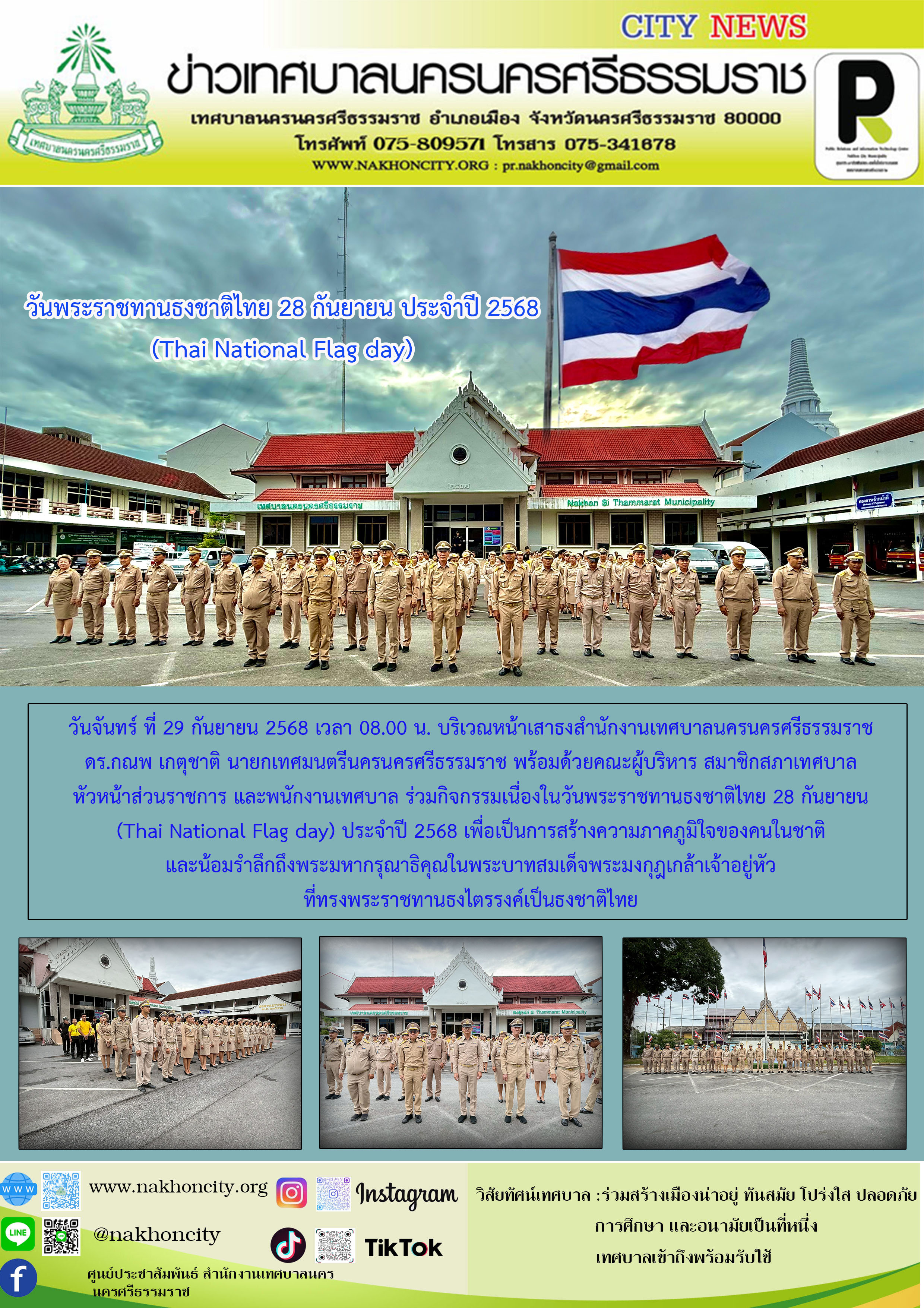 วันจันทร์ ที่ 29 กันยายน 2568 เวลา 08.00 น. บริเวณหน้าเสาธงสำนักงานเทศบาลนครนครศรีธรรมราช ดร.กณพ เกตุชาติ นายกเทศมนตรีนครนครศรีธรรมราช พร้อมด้วยคณะผู้บริหาร สมาชิกสภาเทศบาล หัวหน้าส่วนราชการ และพนักงานเทศบาล ร่วมกิจกรรมเนื่องในวันพระราชทานธงชาติไทย 28 กันยายน (Thai National Flag day) ประจำปี 2568 เพื่อเป็นการสร้างความภาคภูมิใจของคนในชาติ และน้อมรำลึกถึงพระมหากรุณาธิคุณในพระบาทสมเด็จพระมงกุฎเกล้าเจ้าอยู่หัว ที่ทรงพระราชทานธงไตรรงค์เป็นธงชาติไทย