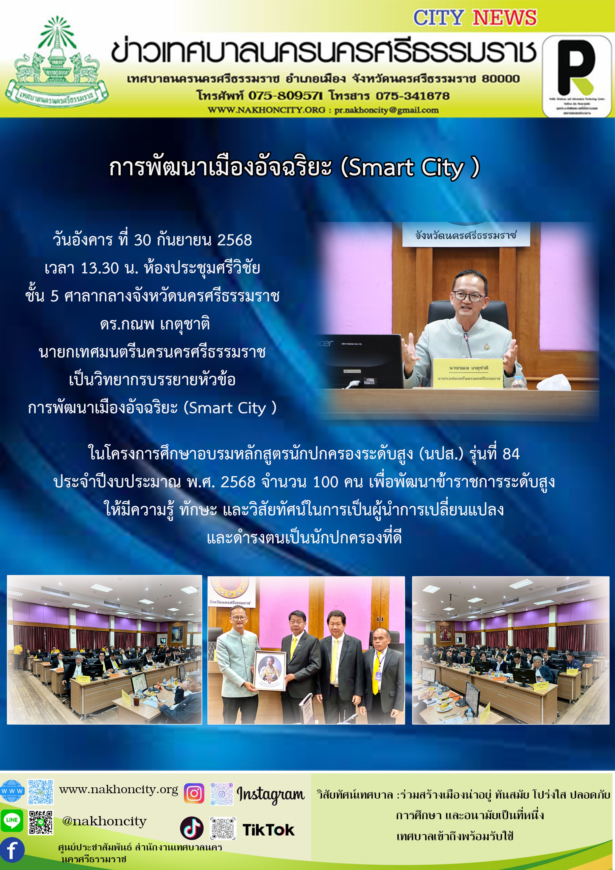 นายกเทศมนตรีนครนครศรีธรรมราช เป็นวิทยากรบรรยายหัวข้อ การพัฒนาเมืองอัจฉริยะ (Smart City ) ในโครงการศึกษาอบรมหลักสูตรนักปกครองระดับสูง (นปส.) รุ่นที่ 84 ประจำปีงบประมาณ พ.ศ. 2568 |