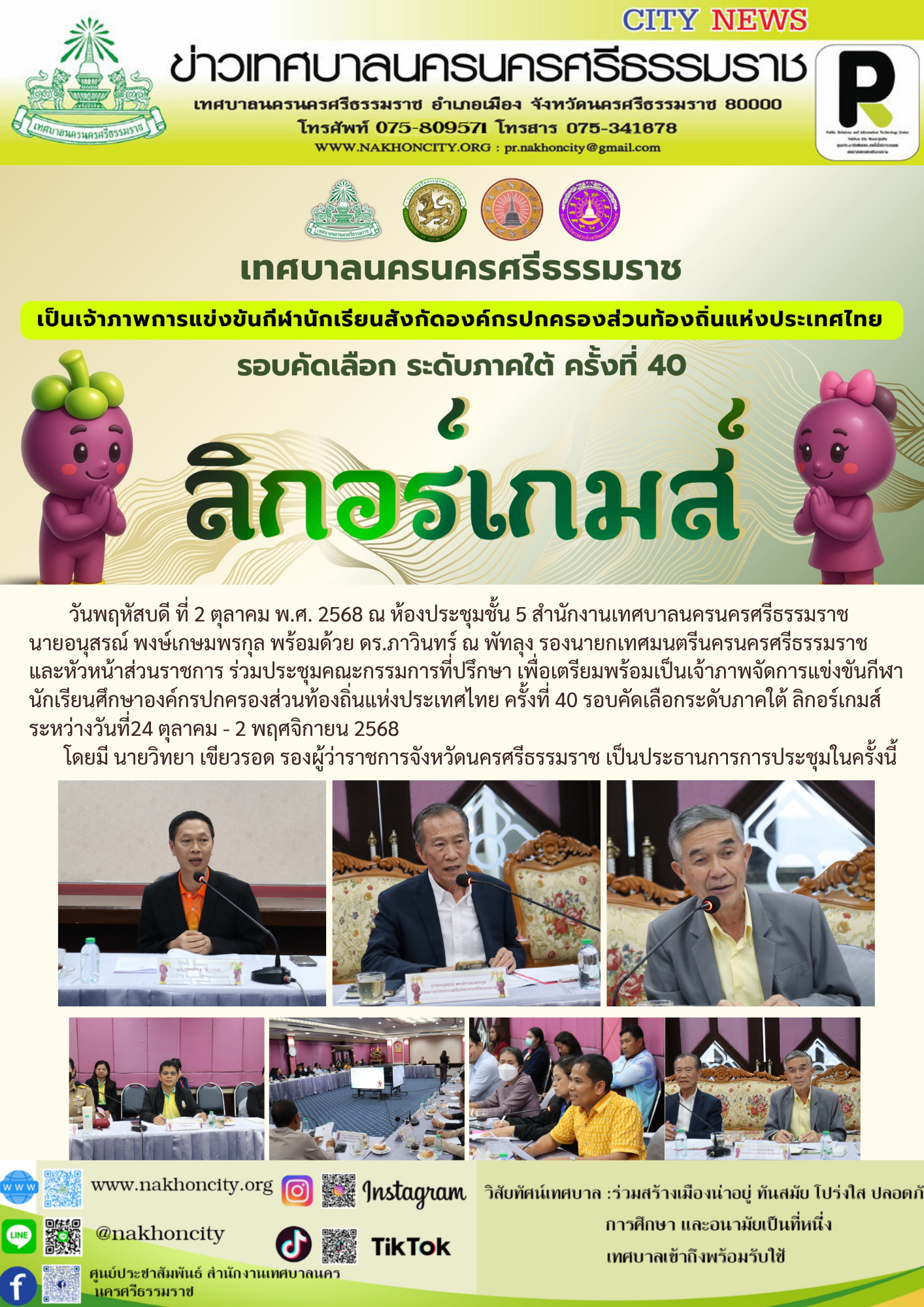 นายอนุสรณ์ พงษ์เกษมพรกุล พร้อมด้วย ดร.ภาวินทร์ ณ พัทลุง รองนายกเทศมนตรีนครนครศรีธรรมราช และหัวหน้าส่วนราชการ ร่วมประชุมคณะกรรมการที่ปรึกษา เพื่อเตรียมพร้อมเป็นเจ้าภาพจัดการแข่งขันกีฬา นักเรียนศึกษาองค์กรปกครองส่วนท้องถิ่นแห่งประเทศไทย ครั้งที่ 40 รอบคัดเลือกระดับภาคใต้ ลิกอร์เกมส์ |