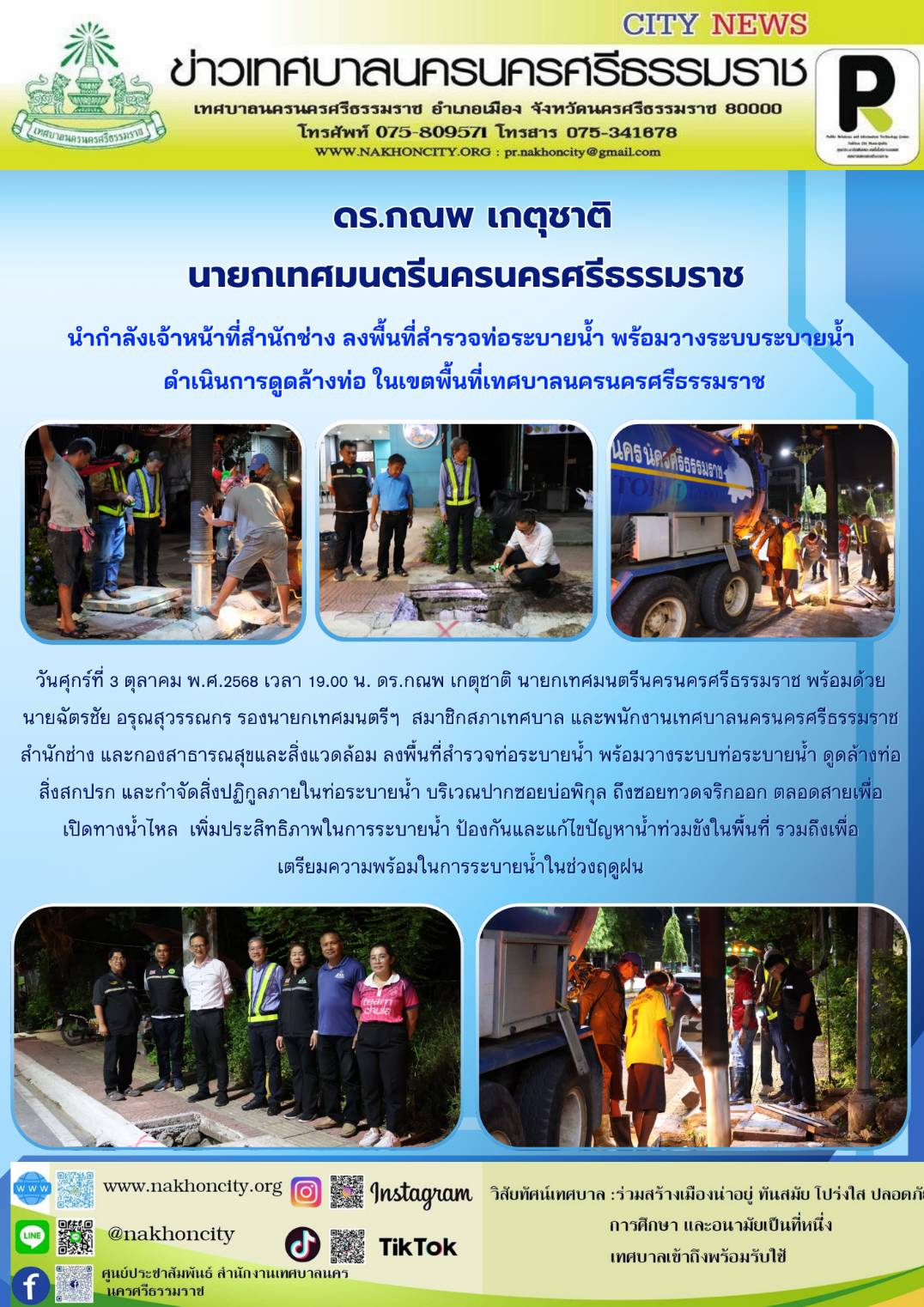 วันศุกร์ที่ 3 ตุลาคม พ.ศ.2568 เวลา 19.00 น. ดร.กณพ เกตุชาติ นายกเทศมนตรีนครนครศรีธรรมราช พร้อมด้วยนายฉัตรชัย อรุณสุวรรณกร รองนายกเทศมนตรีฯ สมาชิกสภาเทศบาล และพนักงานเทศบาลนครนครศรีธรรมราช สำนักช่าง และกองสาธารณสุขและสิ่งแวดล้อม ลงพื้นที่สำรวจท่อระบายน้ำ พร้อมวางระบบท่อระบายน้ำ ดูดล้างท่อสิ่งสกปรก และกำจัดสิ่งปฏิกูลภายในท่อระบายน้ำ บริเวณปากซอยบ่อพิกุล ถึงซอยทวดจริกออก ตลอดสายเพื่อเปิดทางน้ำไหล เพิ่มประสิทธิภาพในการระบายน้ำ ป้องกันและแก้ไขปัญหาน้ำท่วมขังในพื้นที่ รวมถึงเพื่อเตรียมความพร้อมในการระบายน้ำในช่วงฤดูฝน ................. ภาพ//ข่าว//จันทร์จิรา ตรวจทาน//ฐิตินันท์ |