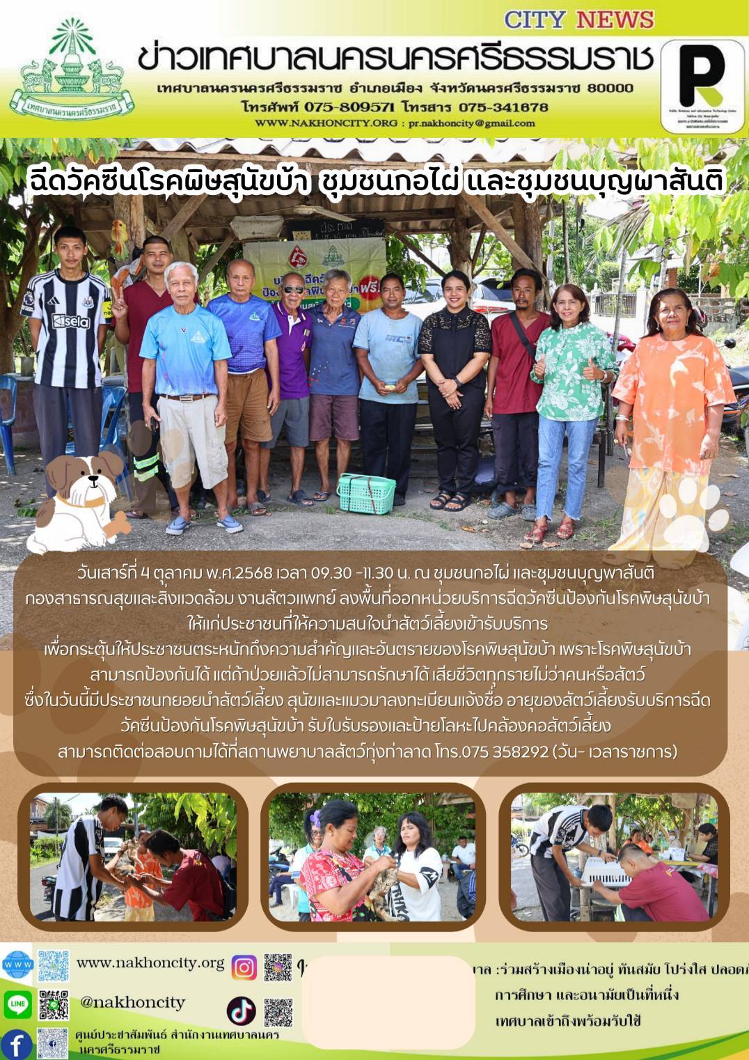 วันเสาร์ที่ 4 ตุลาคม พ.ศ.2568 เวลา 09.30 -11.30 น. ณ ชุมชนกอไผ่ และชุมชนบุญพาสันติ กองสาธารณสุขและสิ่งแวดล้อม งานสัตวแพทย์ ลงพื้นที่ออกหน่วยบริการฉีดวัคซีนป้องกันโรคพิษสุนัขบ้า ให้แก่ประชาชนที่ให้ความสนใจนำสัตว์เลี้ยงเข้ารับบริการ เพื่อกระตุ้นให้ประชาชนตระหนักถึงความสำคัญและอันตรายของโรคพิษสุนัขบ้า เพราะโรคพิษสุนัขบ้าสามารถป้องกันได้ แต่ถ้าป่วยแล้วไม่สามารถรักษาได้ เสียชีวิตทุกรายไม่ว่าคนหรือสัตว์ ซึ่งในวันนี้มีประชาชนทยอยนำสัตว์เลี้ยง สุนัขและแมวมาลงทะเบียนแจ้งชื่อ อายุของสัตว์เลี้ยงรับบริการฉีดวัคซีนป้องกันโรคพิษสุนัขบ้า รับใบรับรองและป้ายโลหะไปคล้องคอสัตว์เลี้ยง สามารถติดต่อสอบถามได้ที่สถานพยาบาลสัตว์ทุ่งท่าลาด โทร.075 358292 (วัน- เวลาราชการ) ................. ภาพ//ข่าว//จันทร์จิรา |