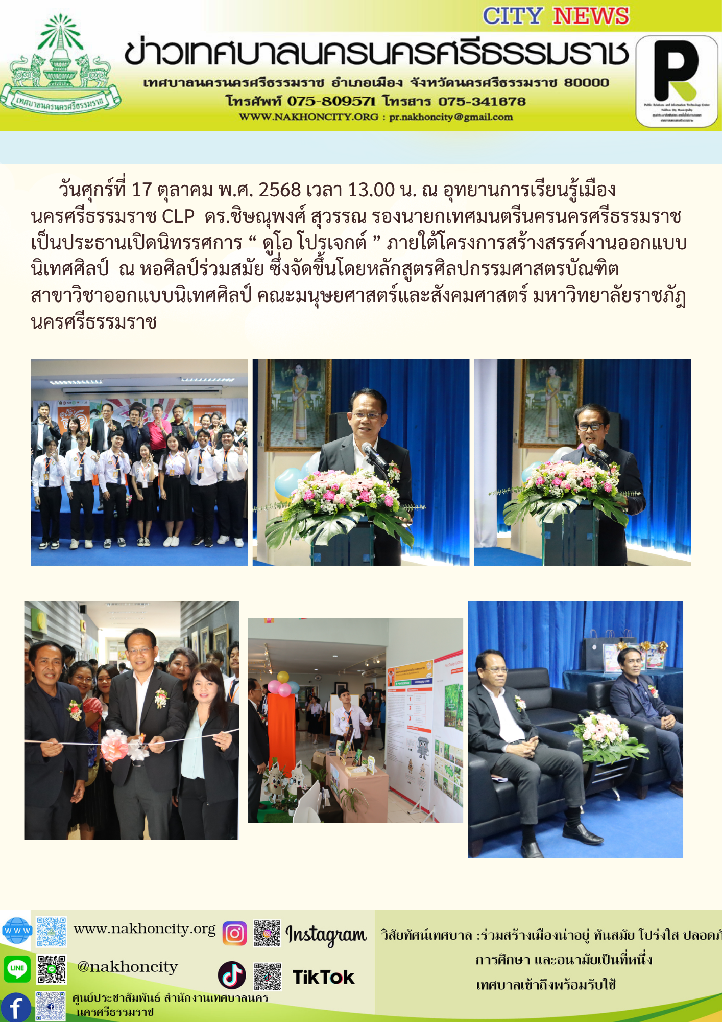 รองนายกเทศมนตรีนครนครศรีธรรมราช  เป็นประธานเปิดนิทรรศการ “ ดูโอ โปรเจกต์ ” ภายใต้โครงการสร้างสรรค์งานออกแบบนิเทศศิลป์  ณ หอศิลป์ร่วมสมัย ซึ่งจัดขึ้นโดยหลักสูตรศิลปกรรมศาสตรบัณฑิต สาขาวิชาออกแบบนิเทศศิลป์ คณะมนุษยศาสตร์และสังคมศาสตร์ มหาวิทยาลัยราชภัฎนครศรีธรรมราช