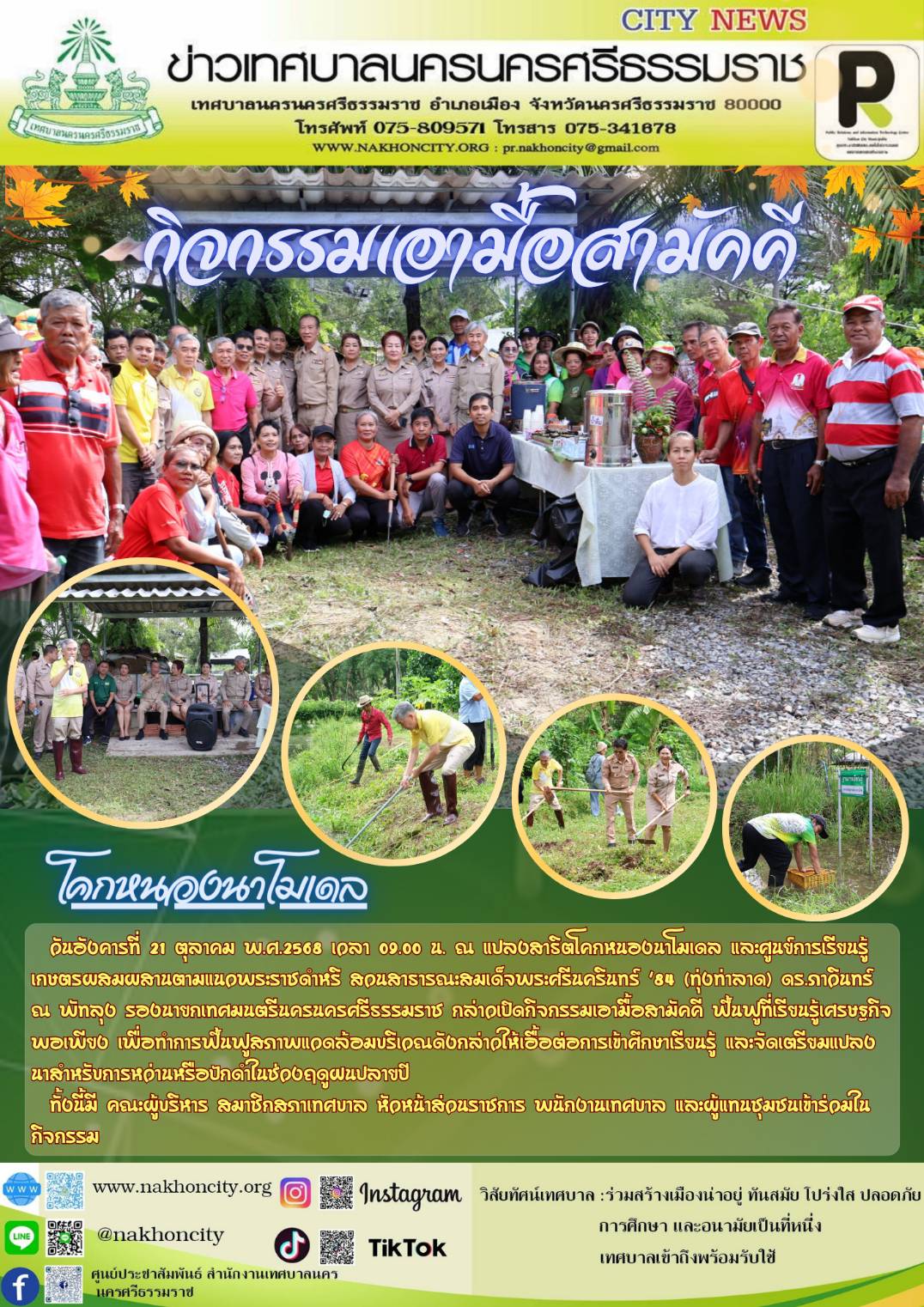 วันอังคารที่ 21 ตุลาคม พ.ศ.2568 เวลา 09.00 น. ณ แปลงสาธิตโคกหนองนาโมเดล และศูนย์การเรียนรู้เกษตรผสมผสานตามแนวพระราชดำหริ สวนสาธารณะสมเด็จพระศรีนครินทร์ ’84 (ทุ่งท่าลาด) ดร.ภาวินทร์ ณ พัทลุง รองนายกเทศมนตรีนครนครศรีธรรมราช กล่าวเปิดกิจกรรมเอามื้อสามัคคี ฟื้นฟูที่เรียนรู้เศรษฐกิจพอเพียง เพื่อทำการฟื้นฟูสภาพแวดล้อมบริเวณดังกล่าวให้เอื้อต่อการเข้าศึกษาเรียนรู้ และจัดเตรียมแปลงนาสำหรับการหว่านหรือปักดำในช่วงฤดูฝนปลายปี